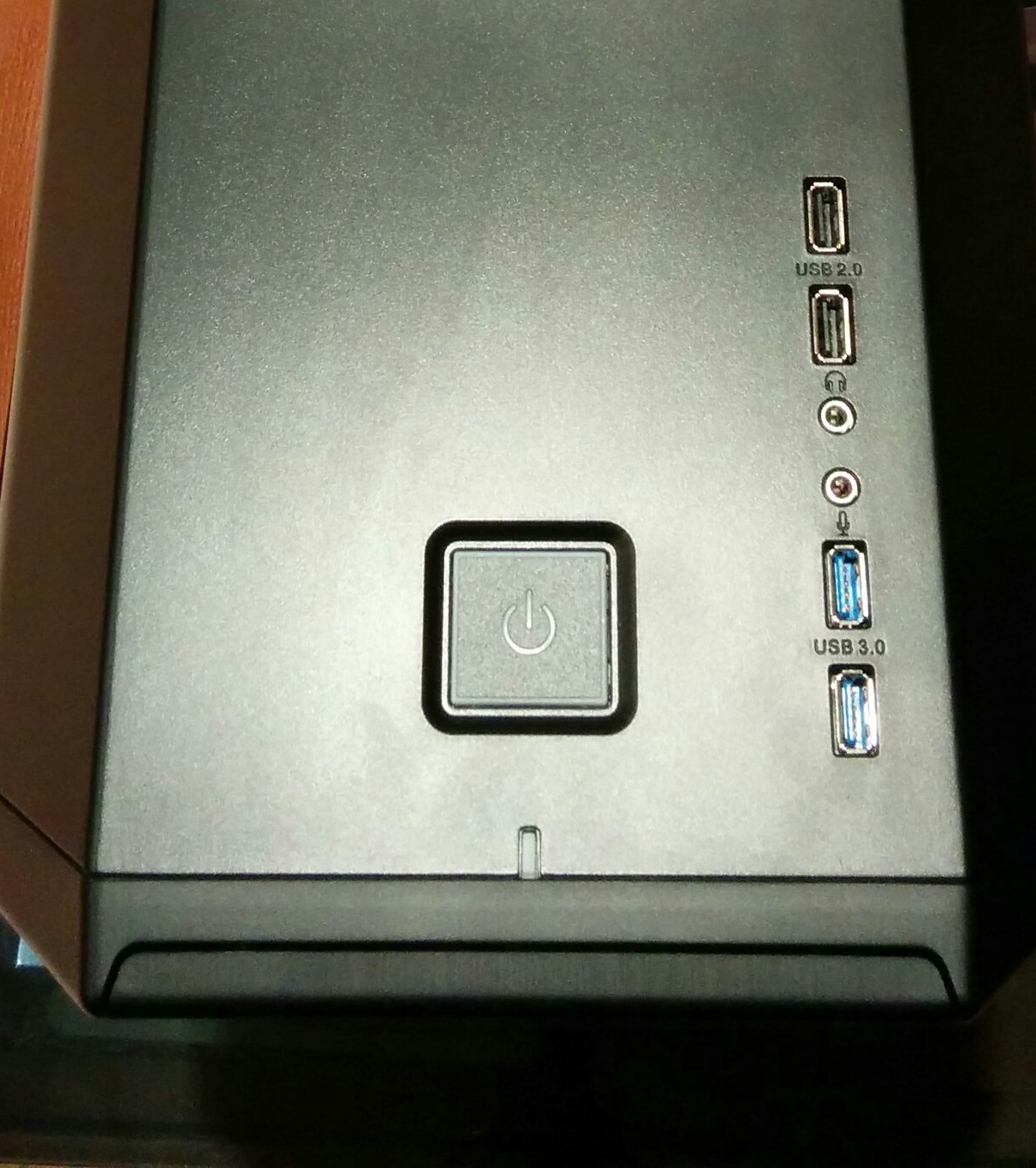 En la parte superior de la carcasa encontramos el botón cuadrado grande de encendido, que se ilumina cuando a su alrededor, luego un pequeño LED de actividad del sistema, y los dos puertos USB 3.0 y dos puertos USB 2.0. También, en el fondo tienen algunas rejillas para ayudar al sistema de refrigeración del chasis.