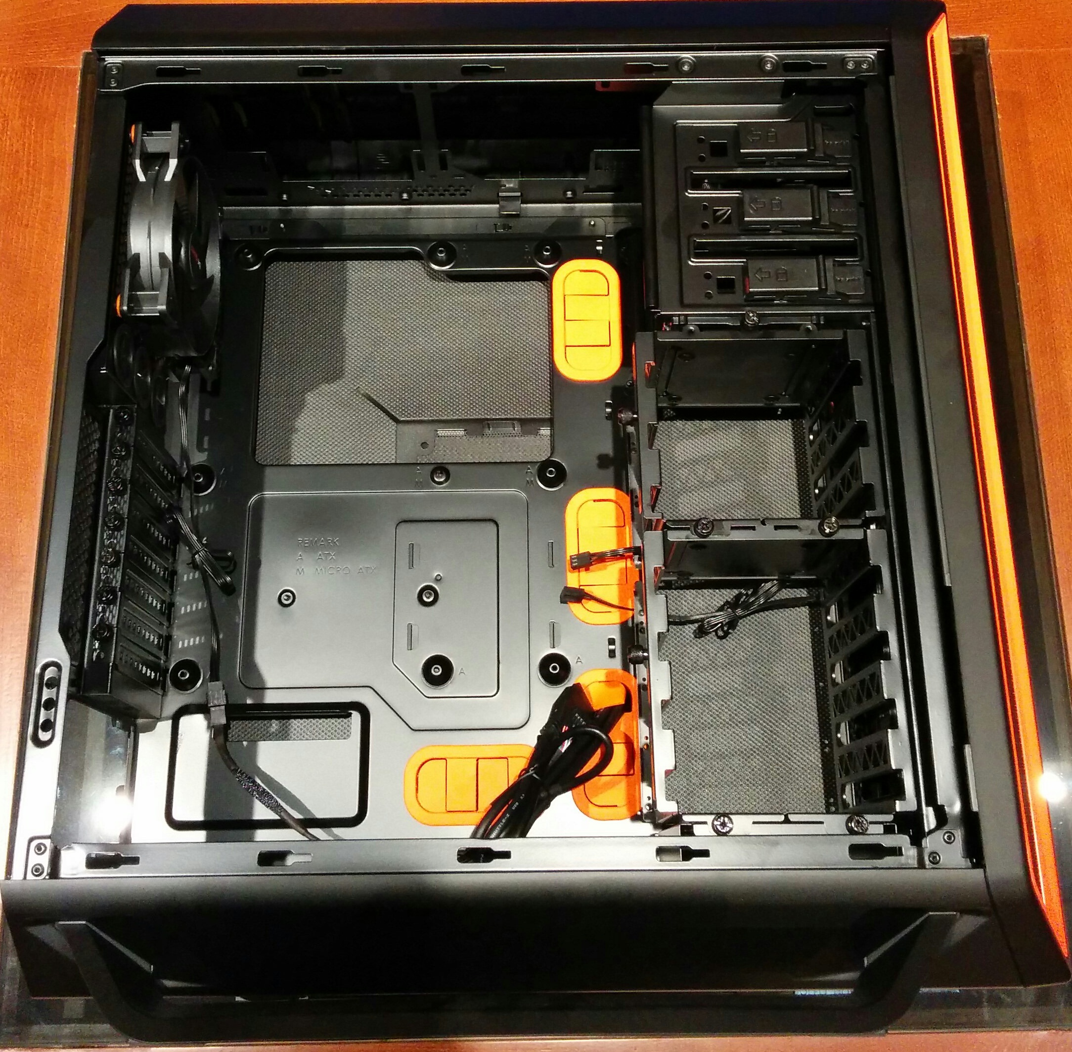 Y ya mirando el interior del chasis, nos damos cuenta que hay un gran espacio para la instalación del hardware, un montón de mecanismos para la instalación de los componentes sin necesidad de utilizar herramientas, y todo pintado de un color negro para mantener su estética elegante. No obstante, juega con algunas partes de color naranja (por nuestro modelo), para darle un contraste llamativo y atractivo al mismo tiempo. Estos son pocos, únicamente de gomas que mantienen los cables bien colocados y fuera del camino donde circula el aire.
