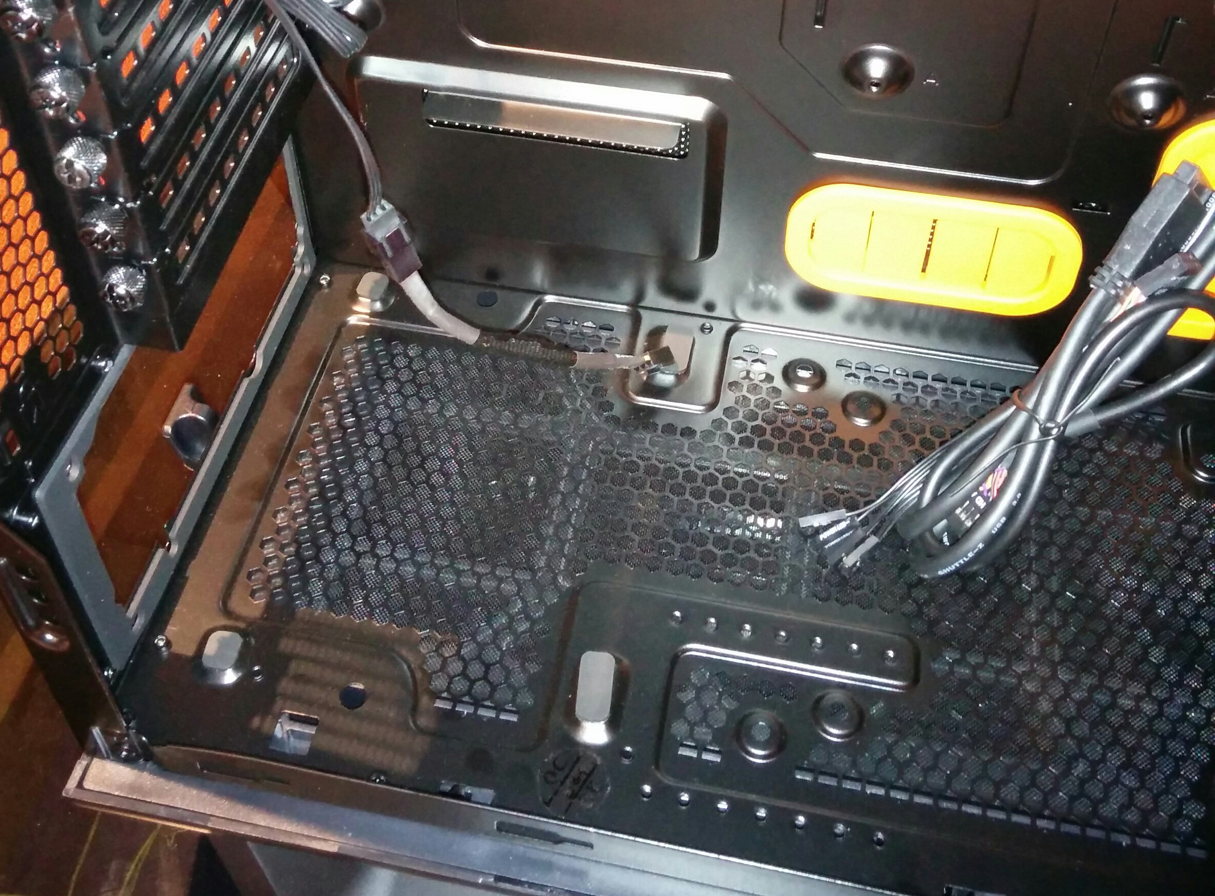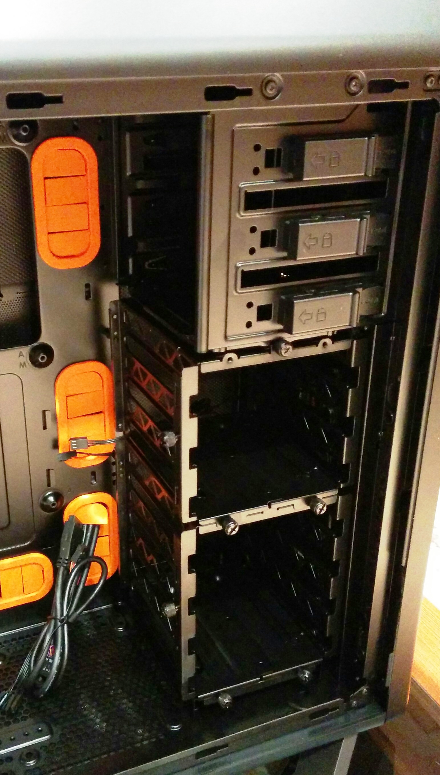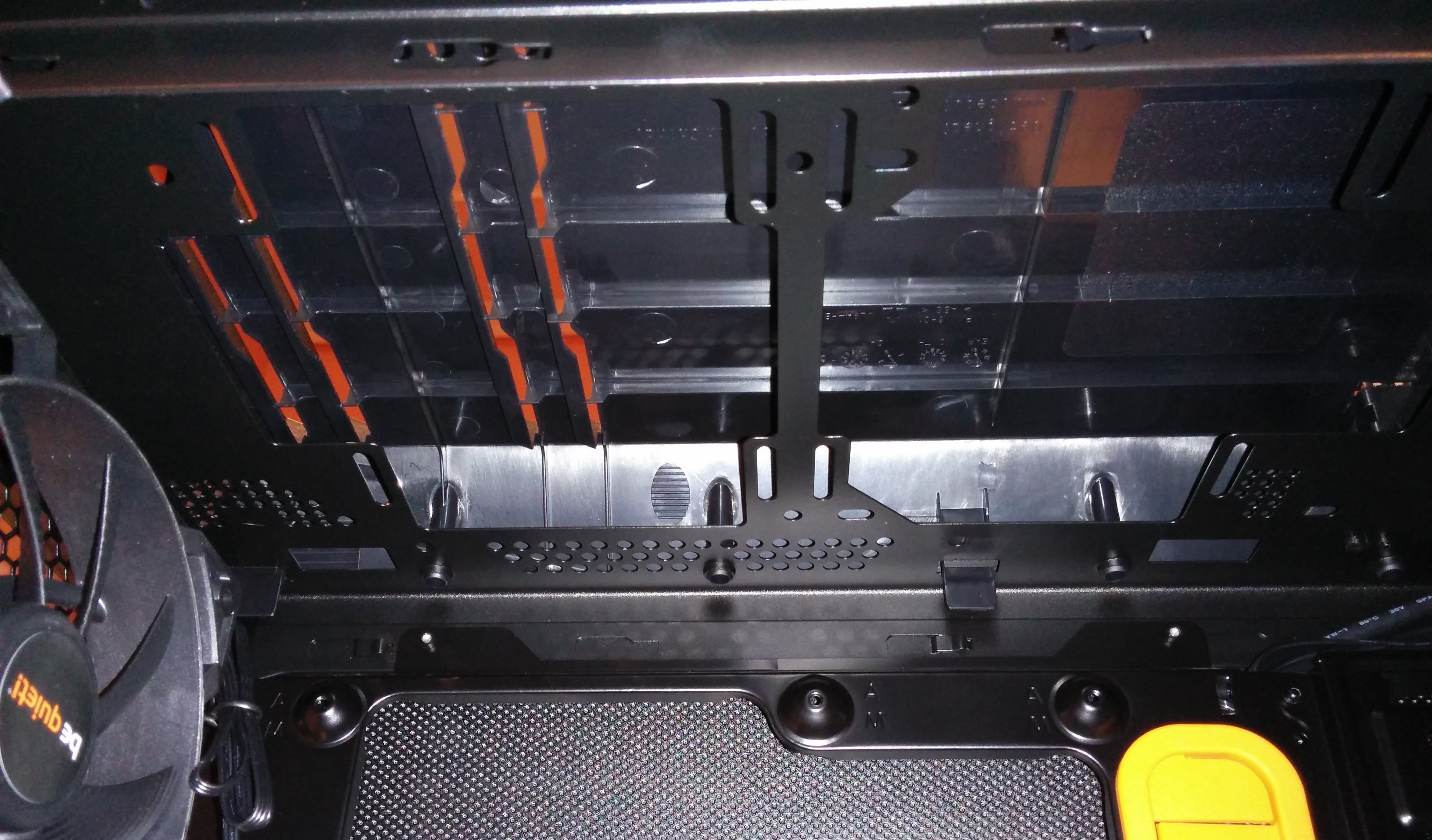 Debajo hay dos jaulas que pueden albergar un total de siete unidades de 3.5 pulgadas. Para la instalación de los discos duros es necesario unas tiras de goma que vienen junto con la carcasa, y estas tiras también son de color naranja por nuestro modelo Orange. Al mismo tiempo, dichas dos jaulas se pueden quitar para así disponer de más espacio si nuestro hardware (sobre todo por las gráficas de gama alta) lo requiere.