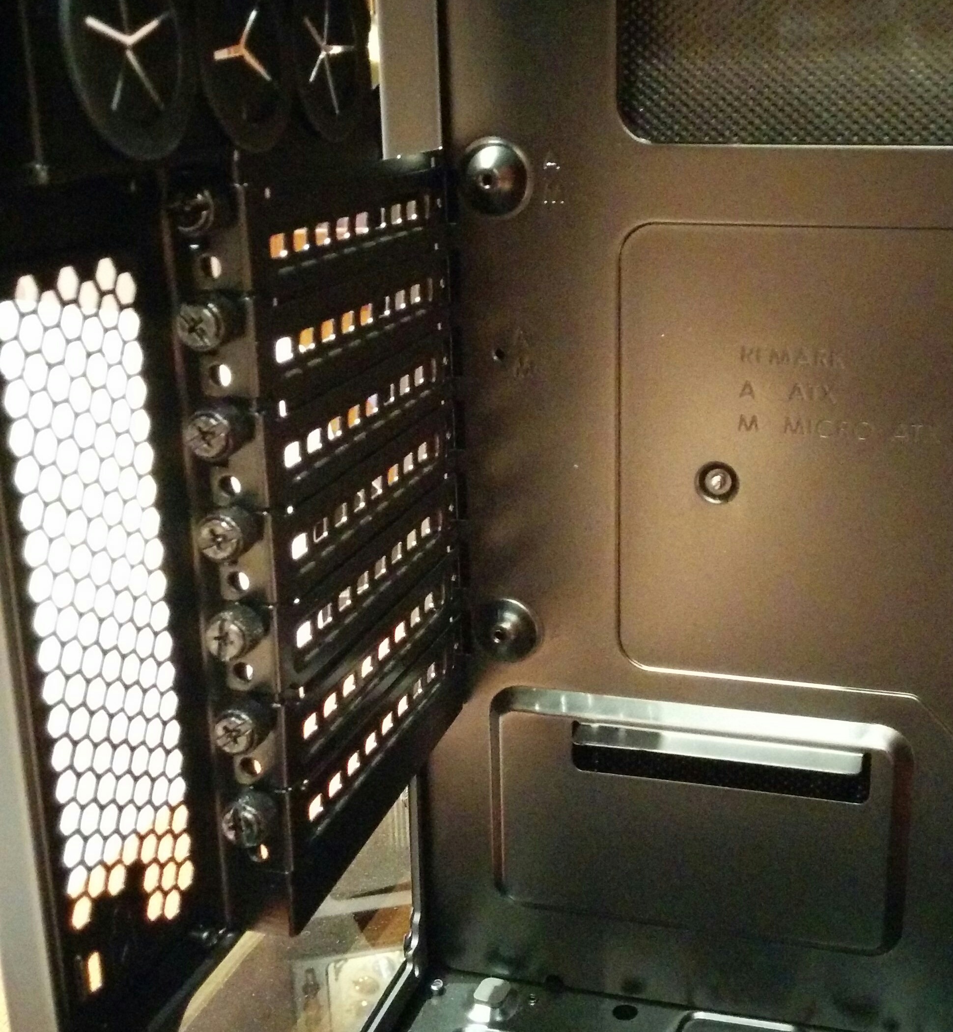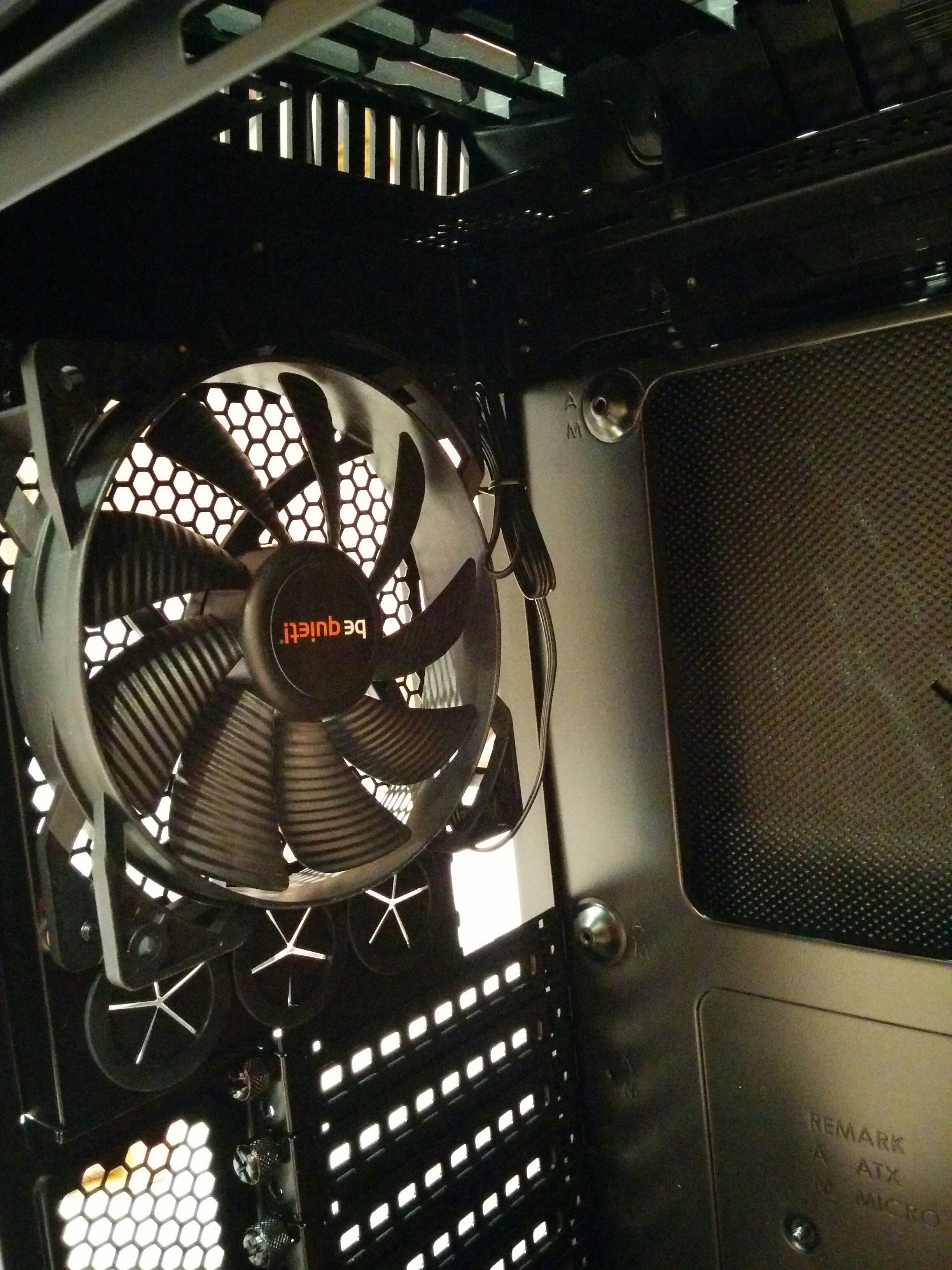 Si miramos más arriba tendremos el ventilador SilentWings 2 de 120mm con el propósito de extraer fuera del chasis el aire caliente que se pueda mantener en el interior del sistema. Y justo a su lado el hueco donde queda el panel trasero de la placa base.