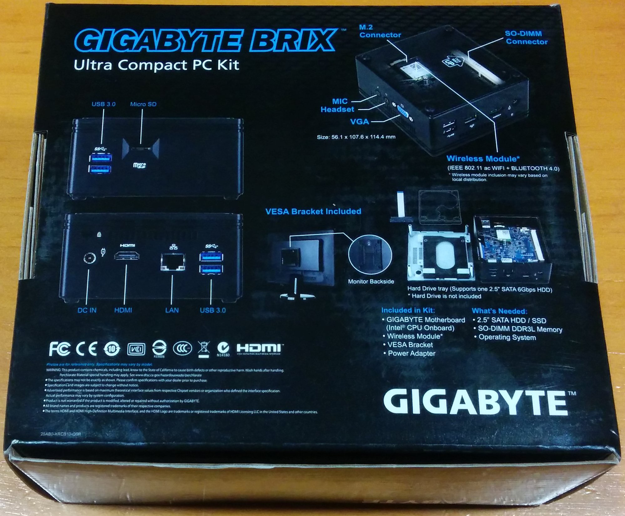 En la parte opuesta aparece varias imágenes del Brix GB-Bace-3150 informando al usuario de sus diferentes puertos externos (USB 3.0, Micro SD, DC IN, HDMI, LAN, Micrófono, auriculares, VGA) y las característica VESA, puerto M.2 ocupado por el módulo Wireless IEEE 802.11ac Wi-Fi + BlueTooth 4.0, lo que se incluye en el Kit (placa base Gigabyte con procesador Intel CPU en placa, módulo Wireless, adaptador VESA y adaptador de corriente) y lo que se necesita para la su total montaje (unidad de almacenamiento de 2.5″ SATA HDD o SSD, un módulo de memoria SO-DIMM DDR3L y el sistema operativo).