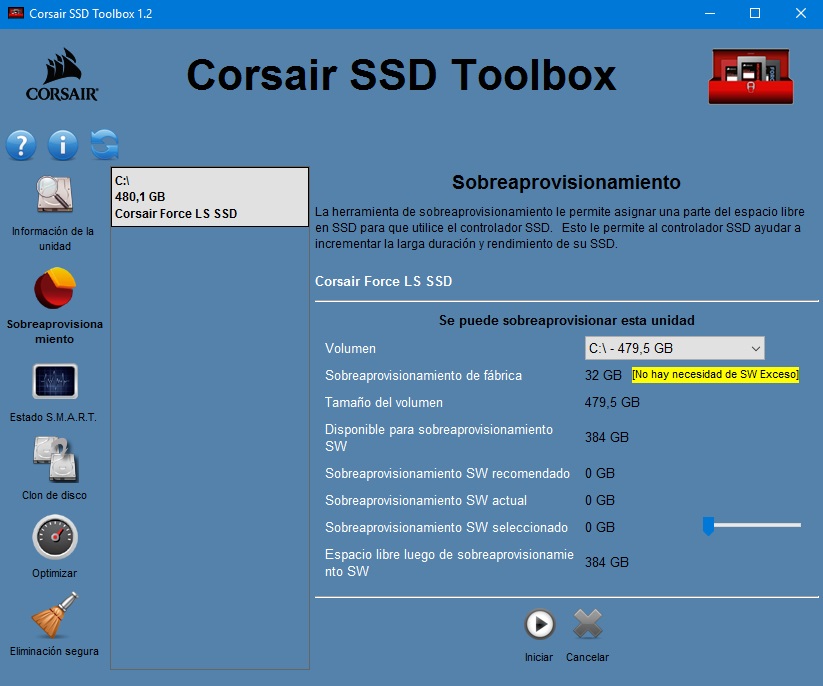 En la segunda opción, Sobreaprovisionamiento, permite al usuario asignar un espacio específico de la capacidad del SSD para que sea utilizada el controlador de la unidad, incluso informa si es necesario o no, como es en el caso del Corsair Force LS ya que éste reserva 32GB de fábrica.