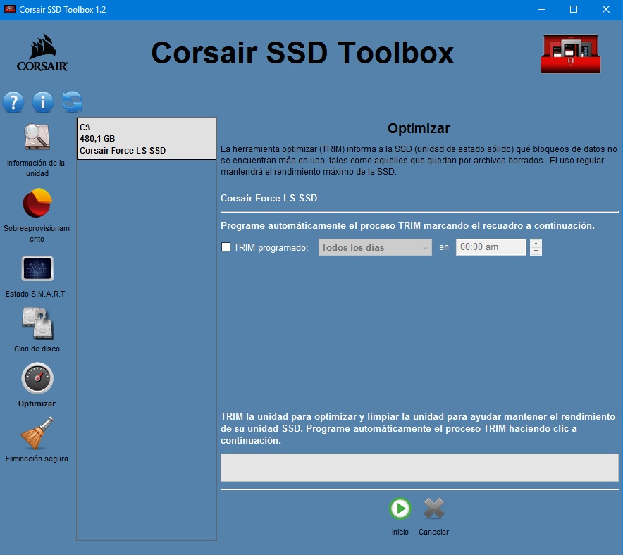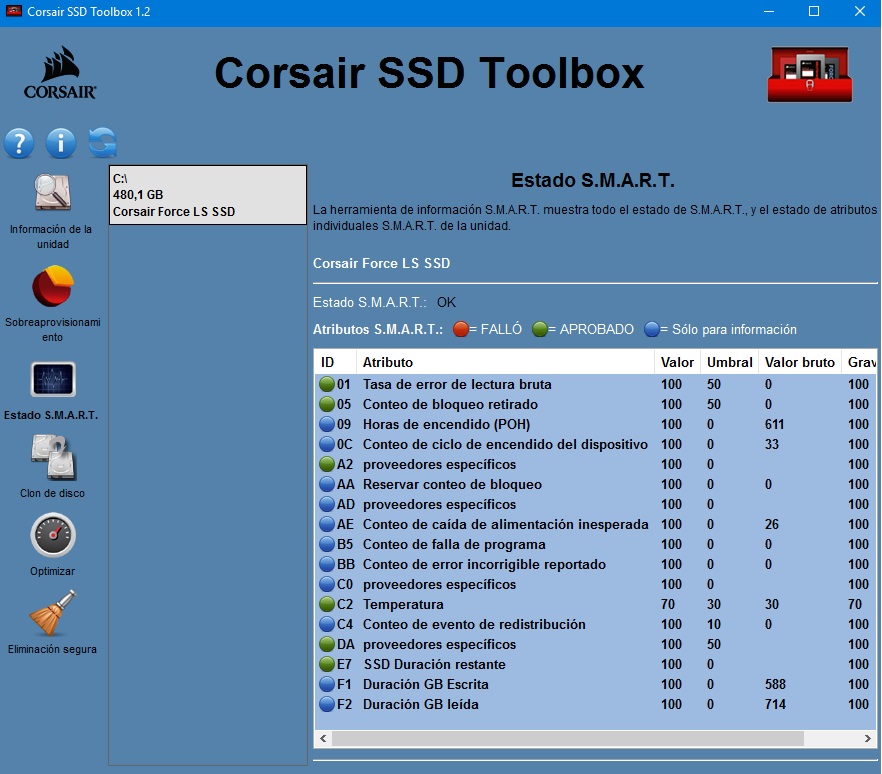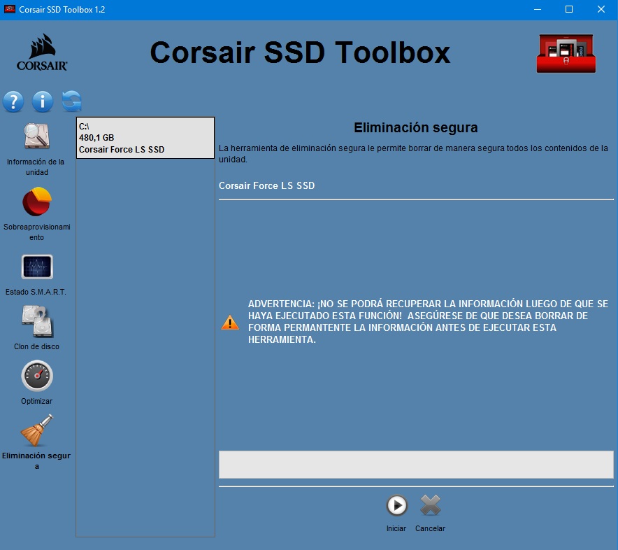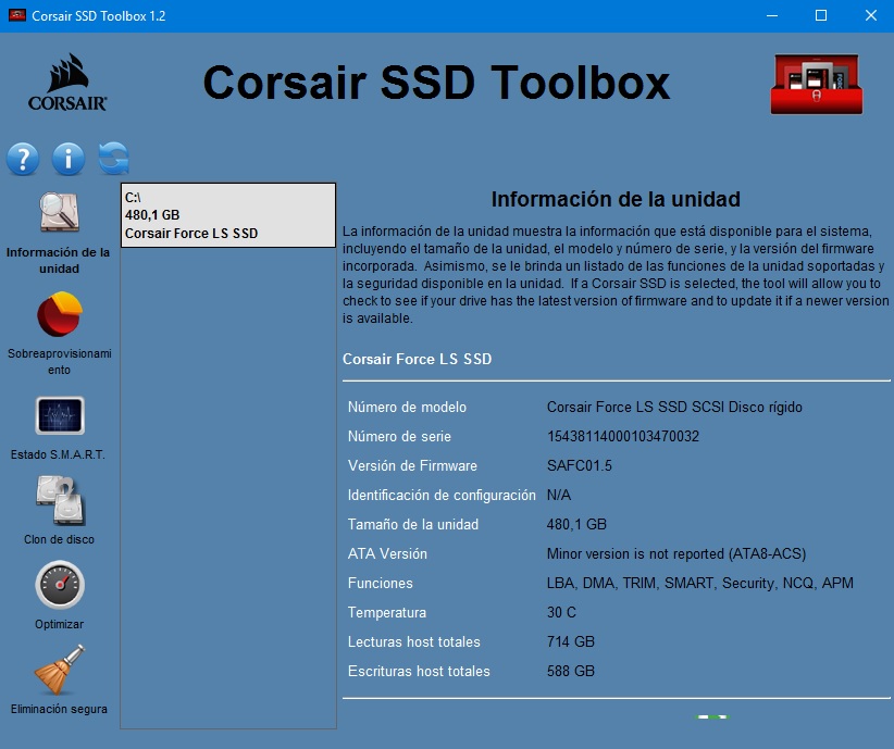 Corsair SSD Toolbox es un software creado por la propia compañía para mostrar cierta información del estado de nuestro SSD, así como de permitir ciertas tareas del mismo. Aunque no se proporciona junto con la caja del SSD Corsair Force LS 480GB, la compañía tiene este software en su página web oficial para poder descargar.