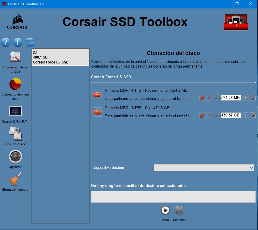 En la cuarta opción, Clon de disco, permite realizar una copia exacta de toda la unidad SSD de Corsair a otra unidad que se desee. Pero hay que recordar que esta operación borraría todos los datos existentes en el SSD de destino.