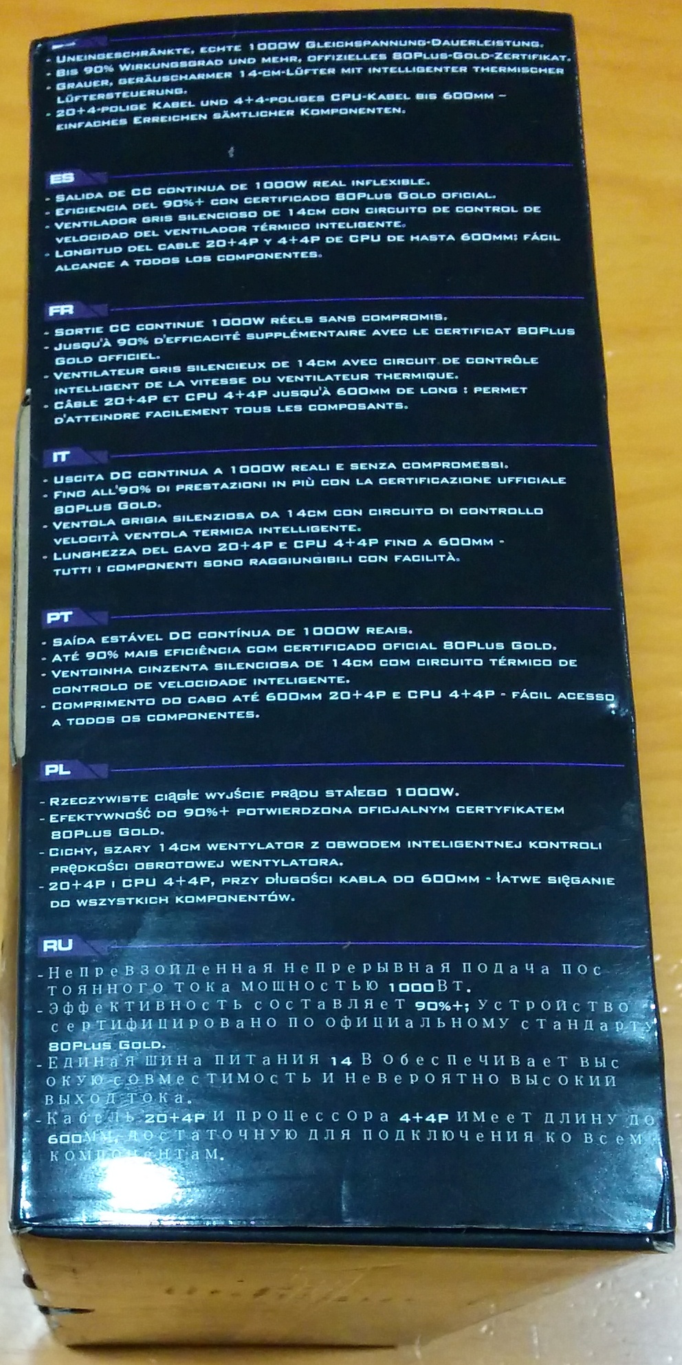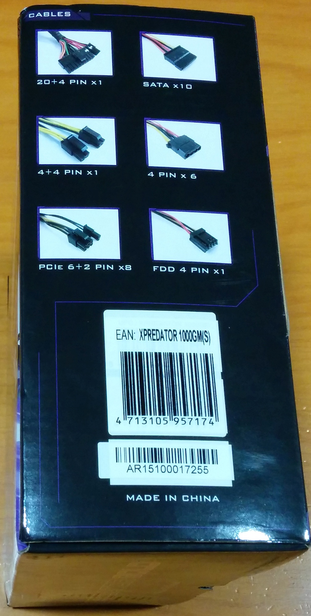 En el lado derecho pone todos los conectores que presenta la fuente (1x 20+4pines, 1x 4+4pines, 10x SATA, 6x Molex, 8x PCIe 6+2pines y 1x FDD), el número EAN, su número de serie y fabricación en China.