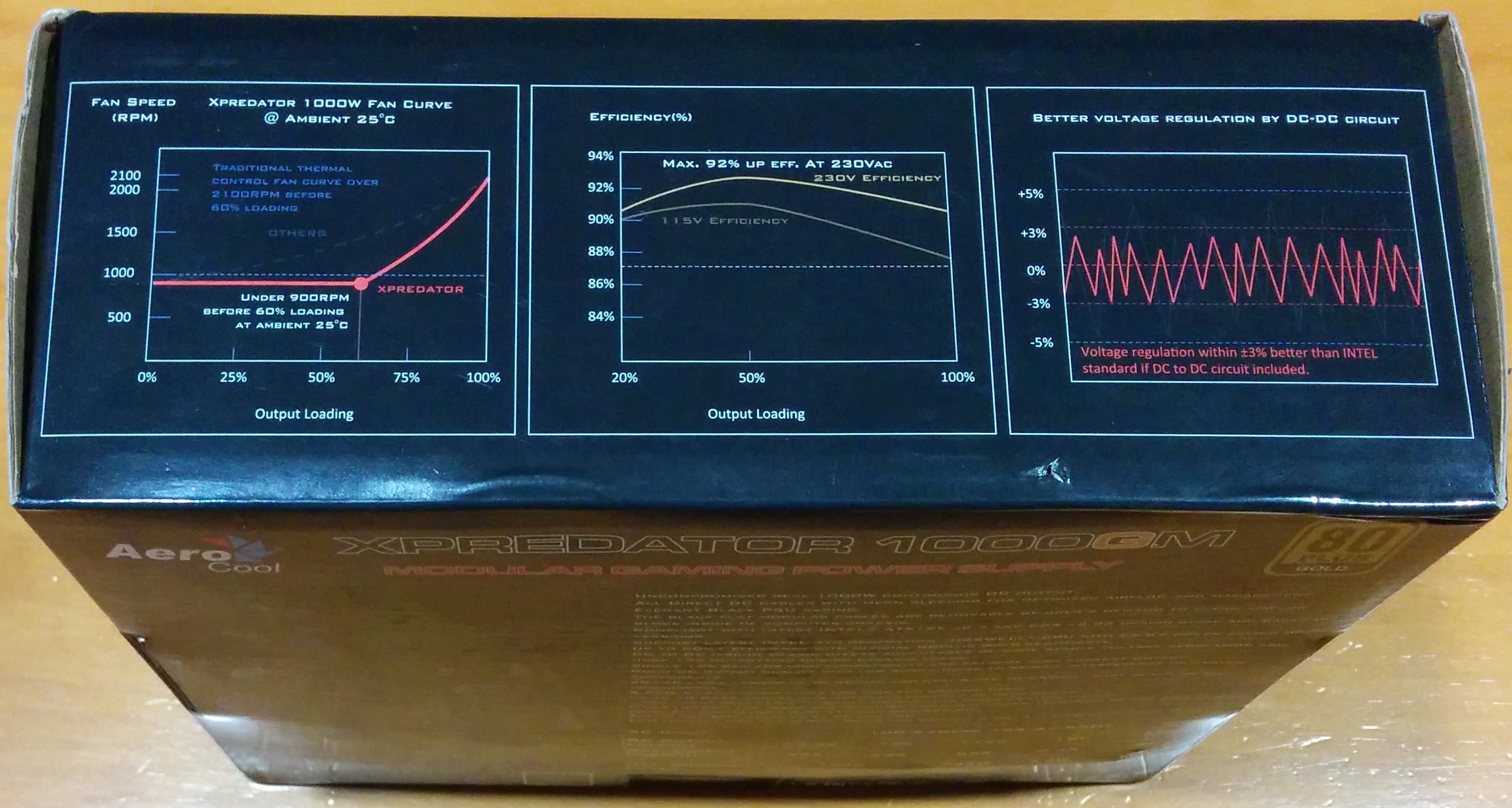 En la parte superior de la caja hay tres gráficos distintos. El primero muestra la curva de la velocidad del ventilador que se sitúa en los 900rpm mientras se mantiene la fuente por debajo del 60% de carga y va aumentando hasta los 2100rpm a medida que llega al 100% de carga. El segundo muestra su eficiencia superior al 90% cuando se trabaja con un voltaje de entrada de 230V. Y el tercero la regulación del voltaje gracias a su circuito DC-DC.