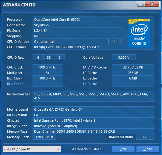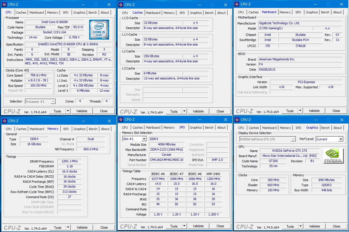 Las capturas de CPU-Z con la placa base Gigabyte Z170X-Gaming G1, el procesador Skylake Intel Core i5-6600K y el kit de memoria de CMK16GX4M4A2400C16 a 2400MHz: