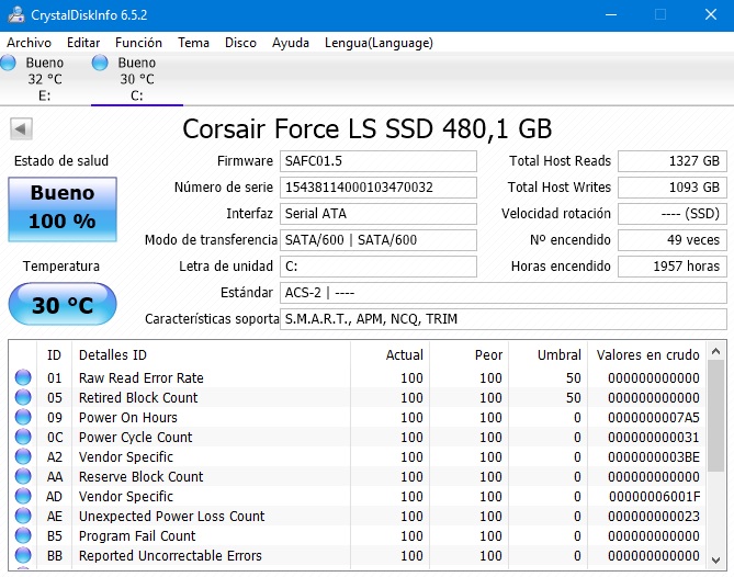 Y última captura sobre uno de los componentes que empleamos para hacer las pruebas del kit, y es del SSD Corsair Force LS de 480GB que contiene el S.O. Windows 10 Pro 64bits. Para ello usamos Crystal Disk Info: