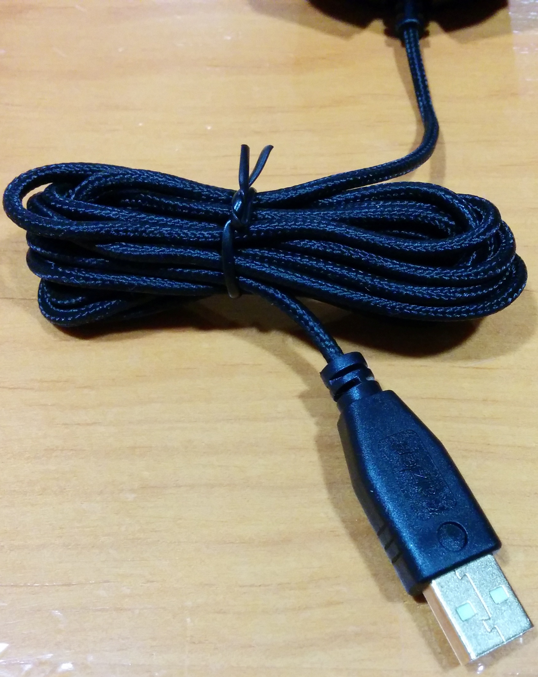 En la parte inferior del ratón vemos tres grandes teflones de calidad para ofrecer un deslizamiento suave, el sensor láser 5G de 16000 ppp de DPI, y un adhesivo que informa el modelo y número de serie del ratón. Por último, cabe mencionar su cable de fibra trenzado de 2.1 metros con un protector al comienzo del cable para evitar los típicos cortes que aparecen con el tiempo. El conector USB está chapado en oro, lo hace aún más resistente y de conexión más estable.