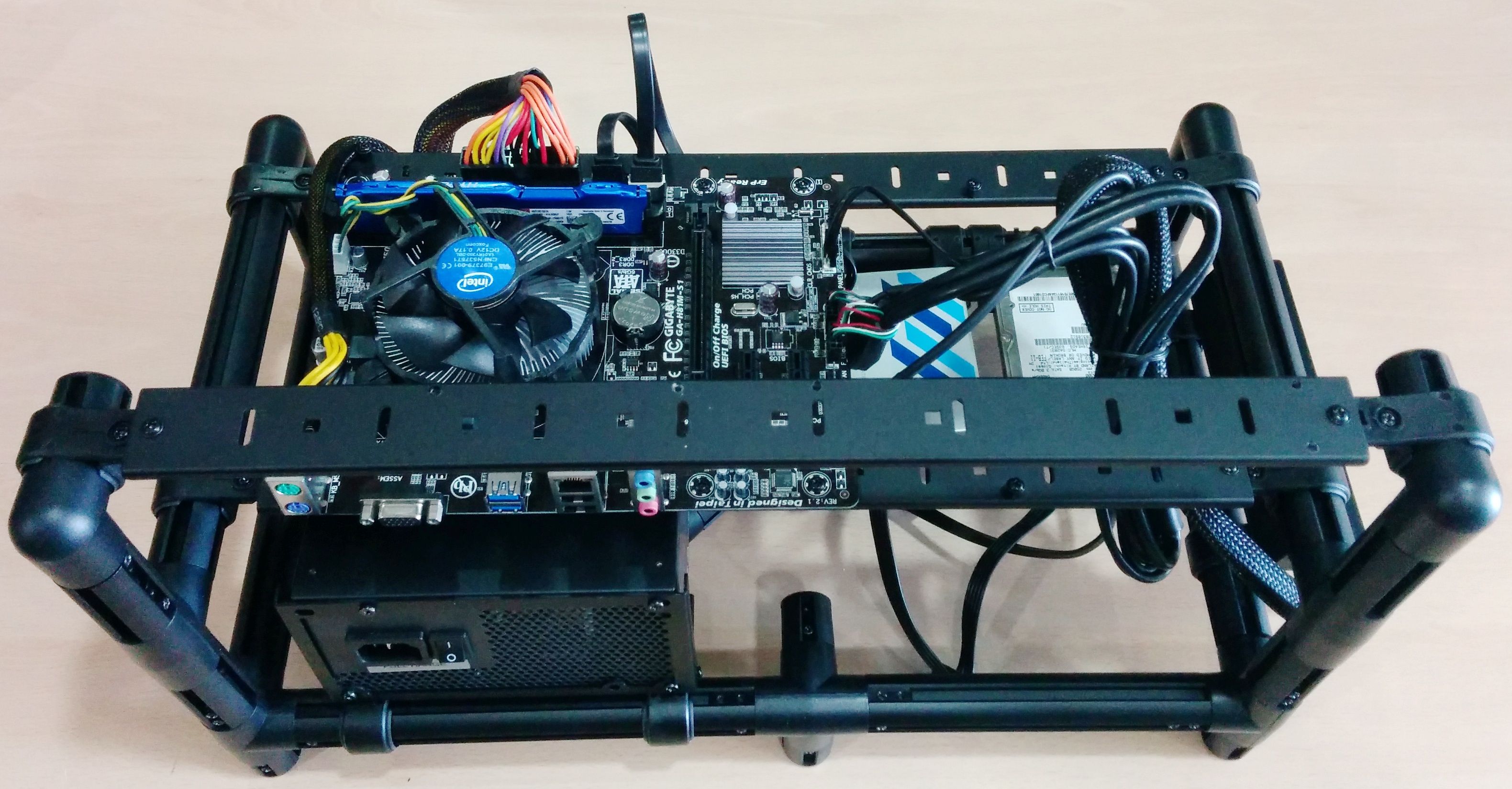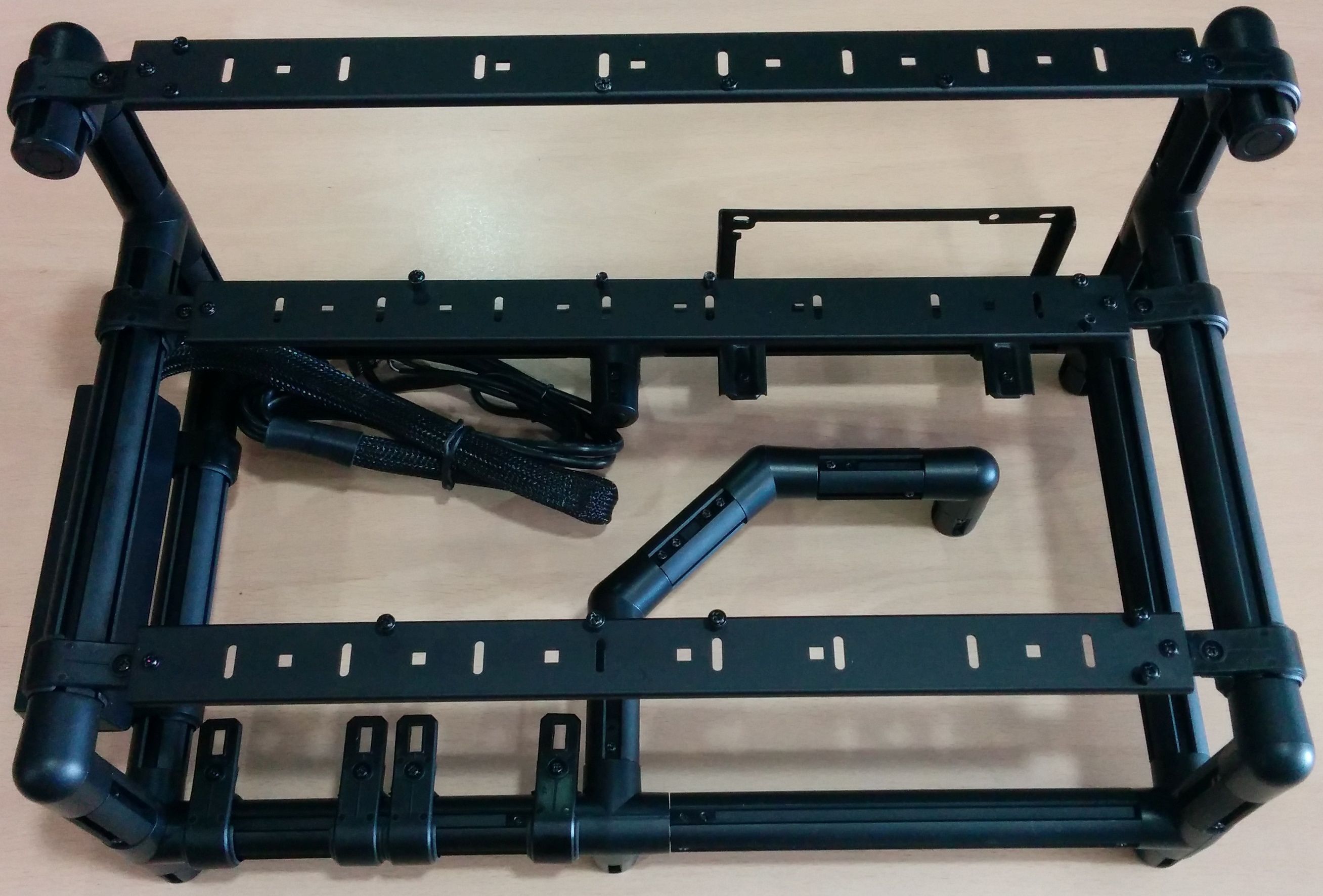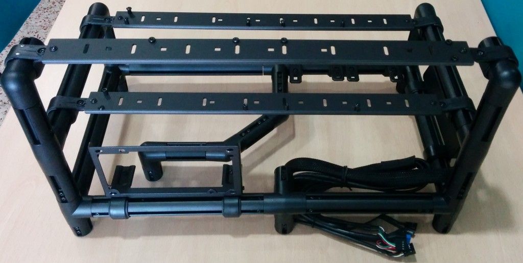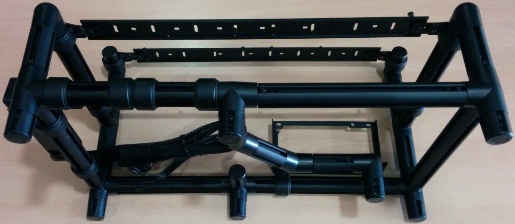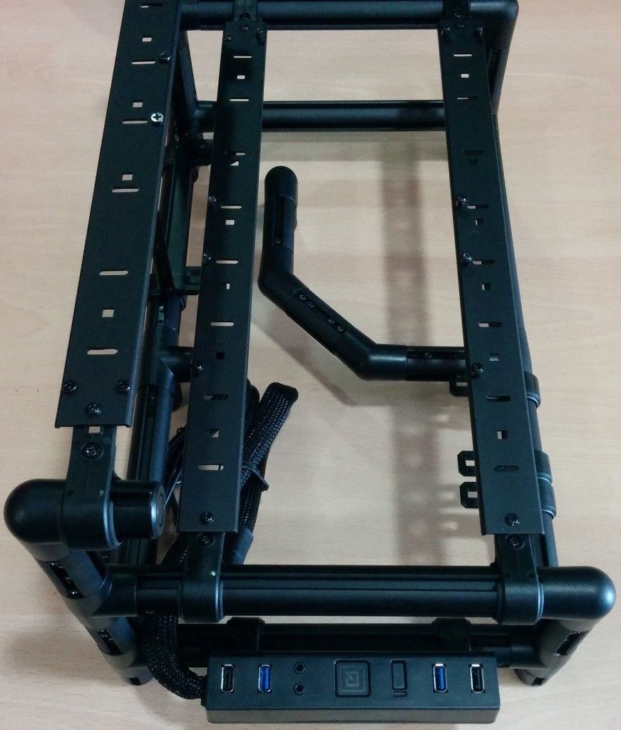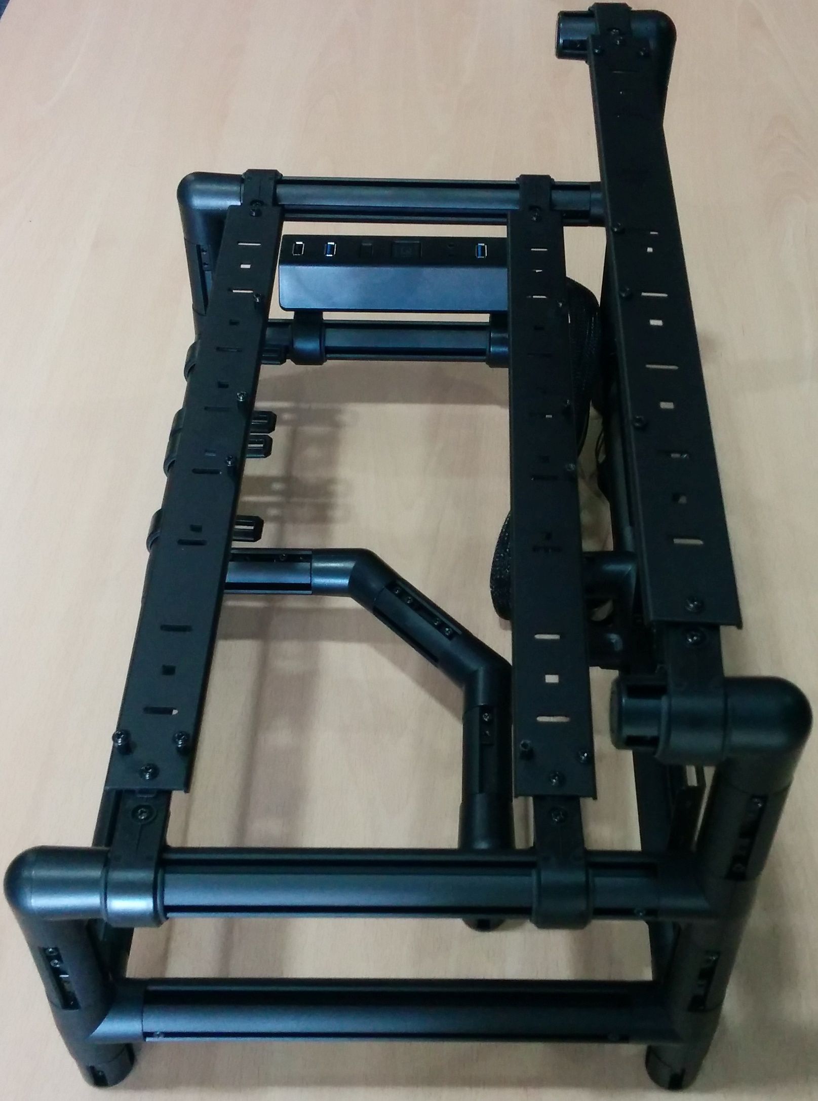 El diseño que hemos creado es rectangular, de dos alturas. La inferior es para la instalación de unidades de almacenamiento, la fuente de alimentación, la gestión de los cables y, en uno de los tubos de aluminio laterales, el panel de control y puertos USBs y de audio.