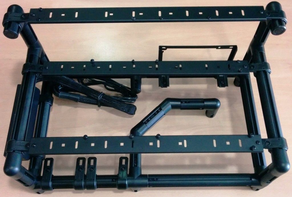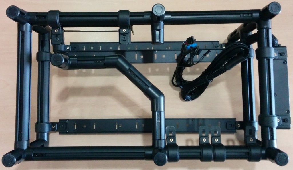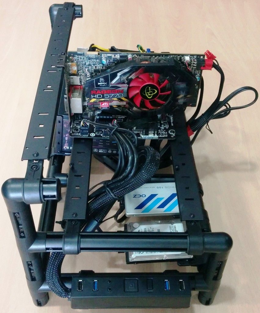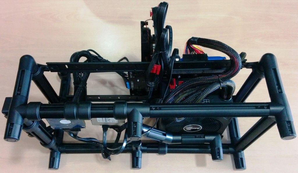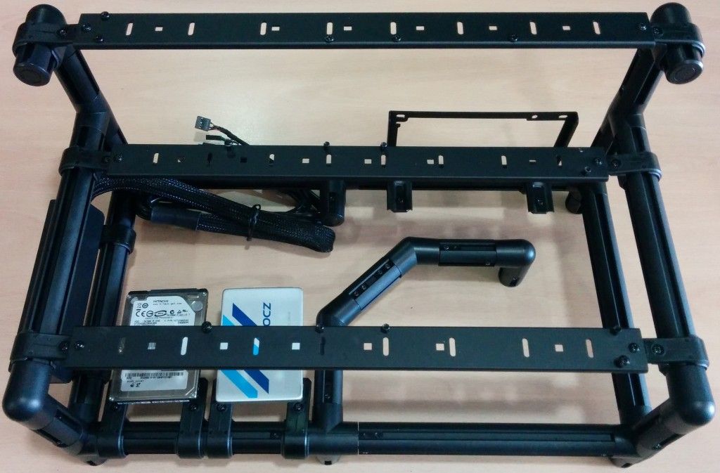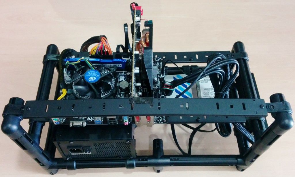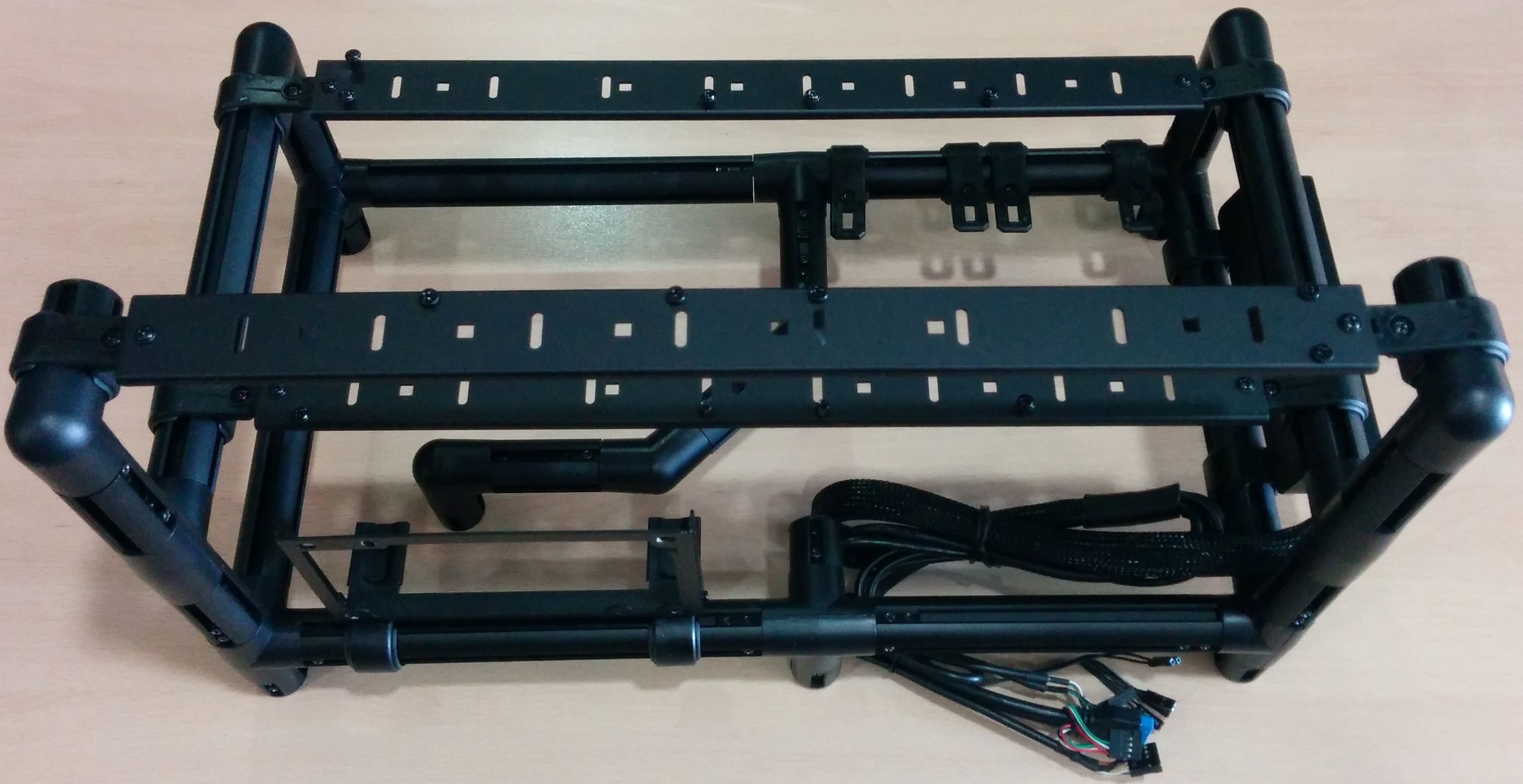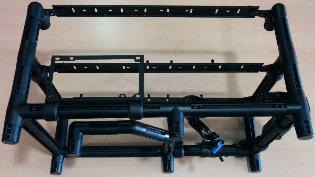 El diseño que hemos creado es rectangular, de dos alturas. La inferior es para la instalación de unidades de almacenamiento, la fuente de alimentación, la gestión de los cables y, en uno de los tubos de aluminio laterales, el panel de control y puertos USBs y de audio.