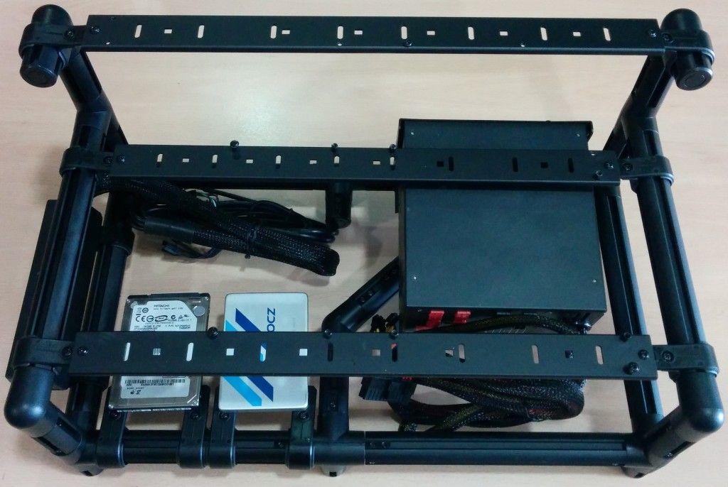 Los discos duros y SSDs de 2.5″ los fijamos al chasis con sólo dos tornillos gracias a las agarraderas en forma de C. La fuente de alimentación también queda en la parte de abajo para que los cables se puedan conectar fácilmente a la placa base y que no molesten por la zona superior. Al mismo tiempo hemos puesto una especie de brazo que hace de apoyo para que la fuente no esté colgando sólo del soporte de la PSU.