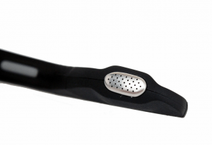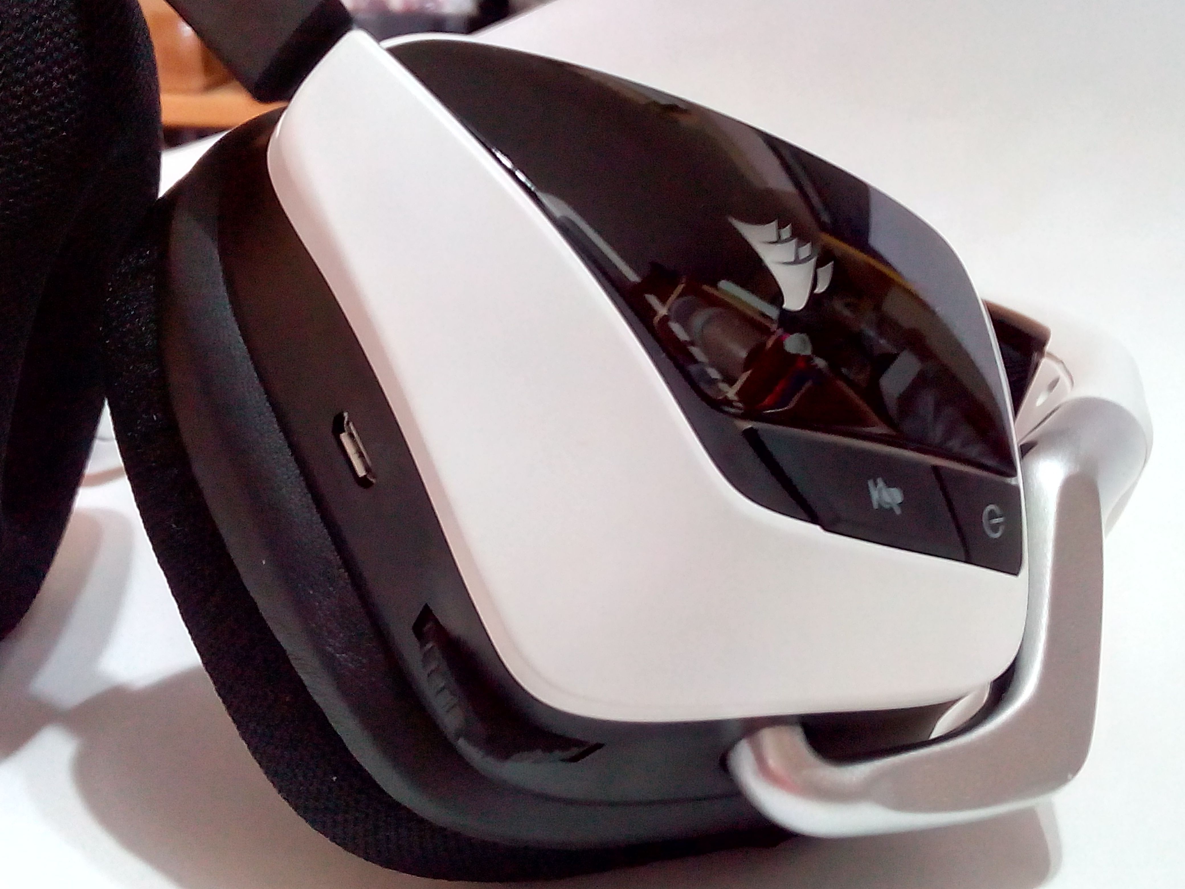 En la orejera izquierda es donde se cuece todo el jugo, justo al lado de los detalles acristalados podemos encontrar dos únicos botones negros. Uno es el botón de encendido de los auriculares y el otro de abajo es para silenciar el micrófono. En la misma orejera tenemos el puerto micro-usb para cargar el periférico y al lado el control de volumen. También en el mismo lado el micrófono, que tiene un tacto como pocos cuando lo deslizas hacia arriba o hacia abajo, va a micro-golpes para que puedas ajustarlo al máximo detalle.