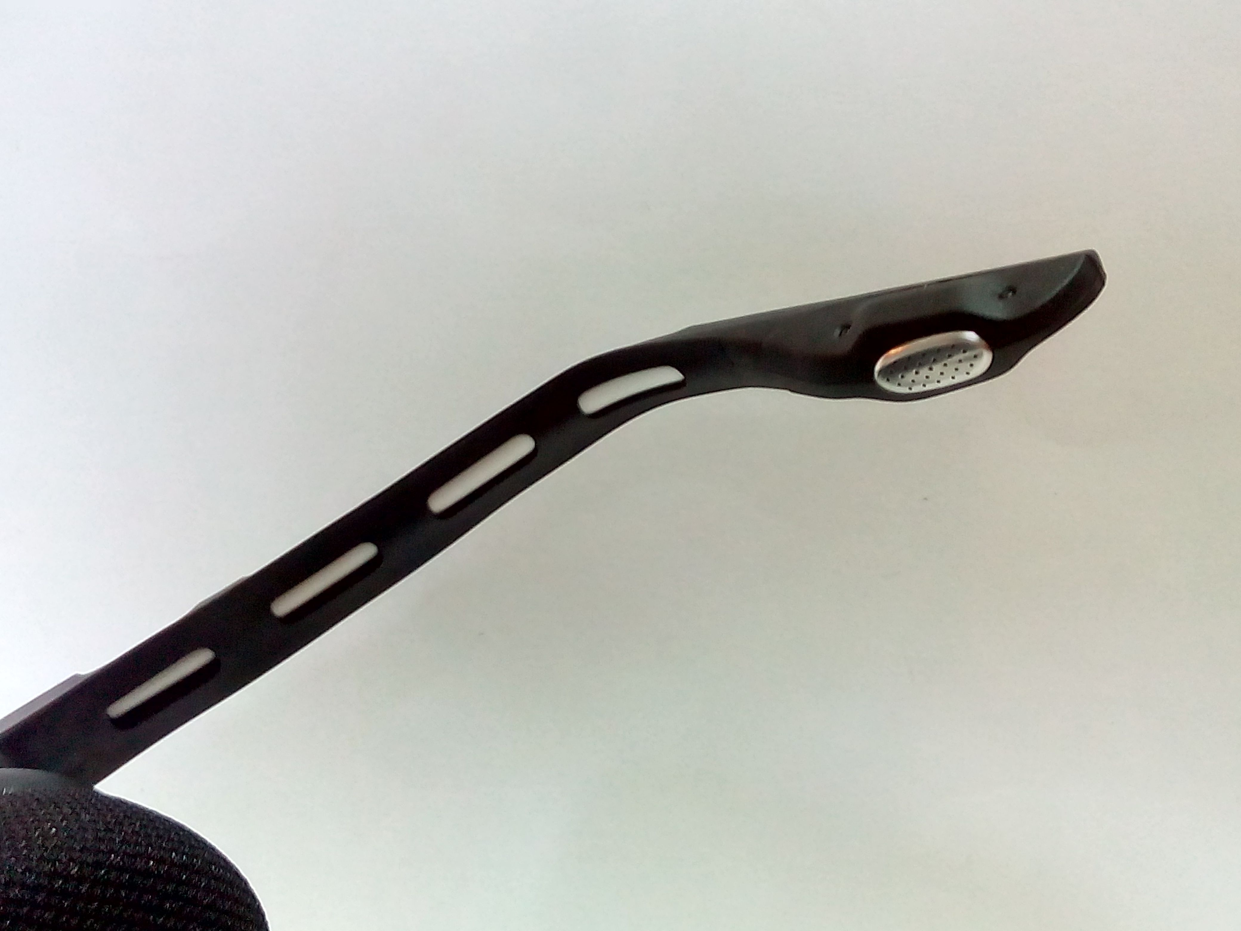 Hablando un poco más del micrófono, hay que sumar al tacto y la suavidad de deslizamiento, una longitud perfecta para que tu boca se quede justo delante, sin molestias ni entorpecimientos. El material del micrófono es de caucho negro con adornos blancos, más que adornos, es como si simulara un cable blanco en su interior, esto hace un efecto que queda muy GAMMING. En la parte final del mismo encontramos la entrada de audio protegida por una plaquita troquelada en cantos-romo de metal con 29 agujeritos, sitio por donde pasa nuestra voz en forma de ondas. Por último, con el tema del micrófono es mencionar uno de sus puntos fuertes, el ya conocido INFOMIC, que se trata de dos LEDs en la parte final del soporte que nos indican con su encendido el estado del micrófono, Dolby y ajustes EQ.