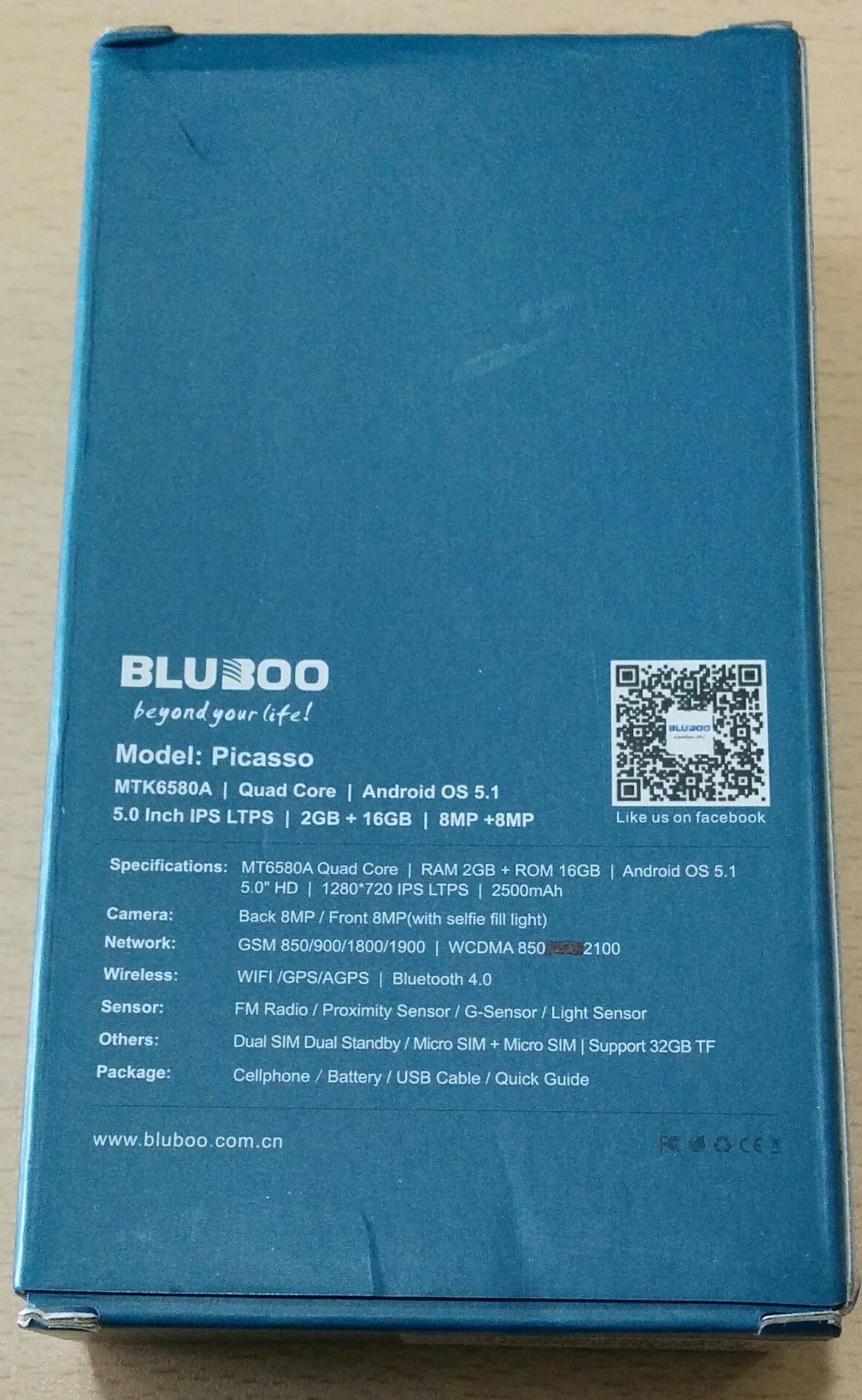 El smartphone Bluboo Picasso viene en una compacta caja de cartón de color azul, que proporciona una protección decente para los problemas que puedan tener en el transporte, por lo que si adquieres uno, podrás estar tranquilo de que el teléfono te va a llegar en perfecto estado.