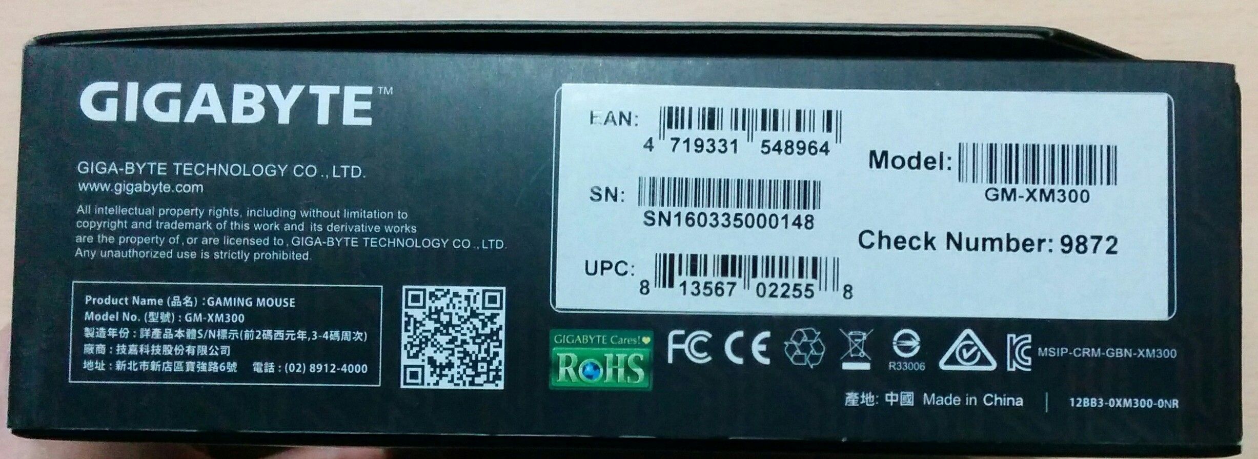 Aparte de las características y especificaciones que ya se comentaron en la introducción, en la parte de abajo de la caja aparecen algunos datos únicos del ratón en cuestión, como el modelo, su código EAN, número de serie y los certificados que cumple.