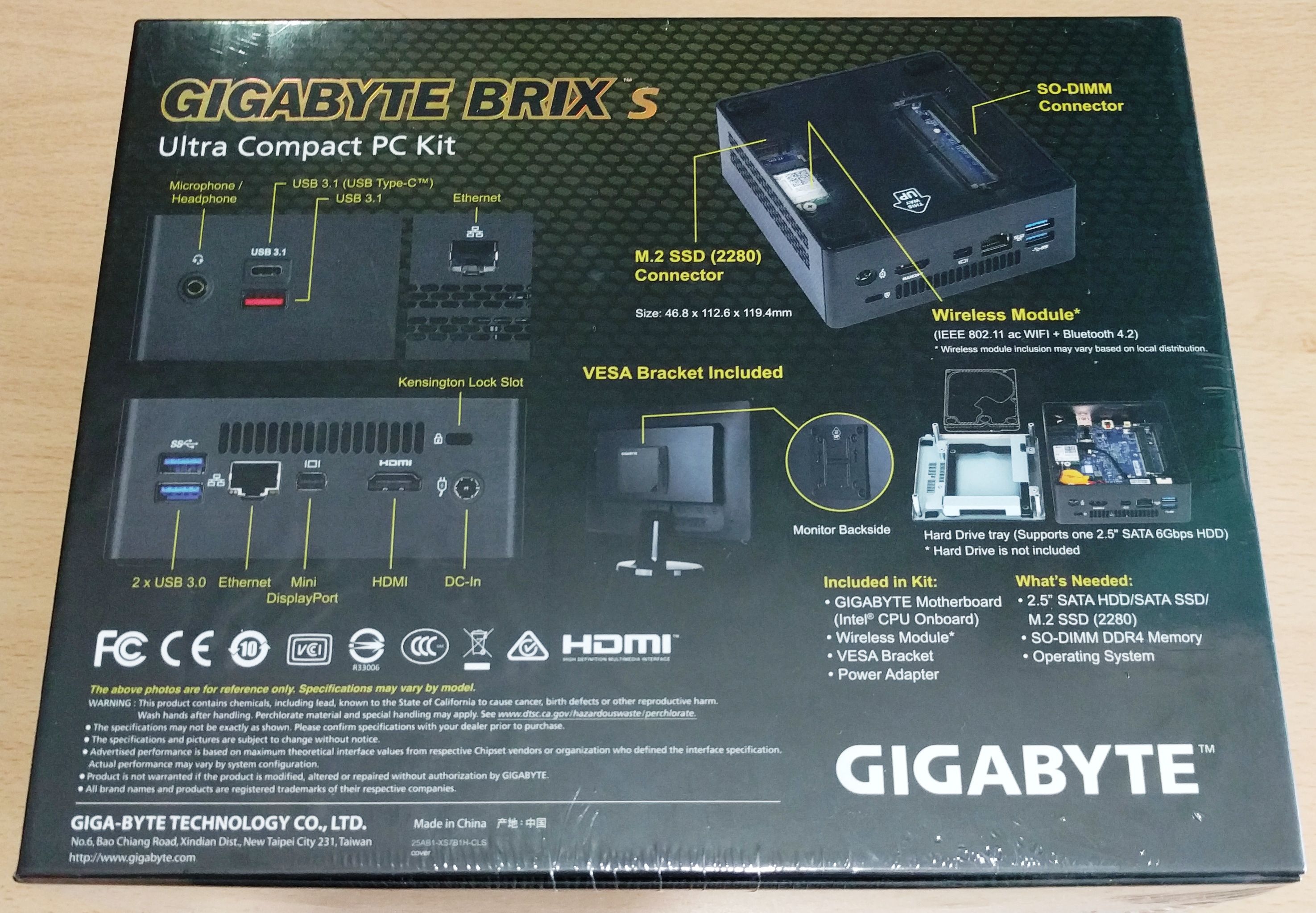 En la parte opuesta aparece varias imágenes del Brix S GB-BSi3HAL-6100 informando al usuario de sus diferentes puertos externos (2 x USB 3.0, USB 3.1, USB 3.1 Type-C, DC IN, HDMI, doble LAN, Micrófono, auriculares, Mini DisplayPort) y las característica VESA, puerto M.2 ocupado por el módulo Wireless IEEE 802.11ac Wi-Fi + BlueTooth 4.0, lo que se incluye en el Kit (placa base Gigabyte con procesador Intel CPU en placa, módulo Wireless, adaptador VESA y adaptador de corriente) y lo que se necesita para la su total montaje (unidad de almacenamiento de 2.5″ SATA HDD o SSD / M.2 (2280), memoria SO-DIMM DDR4 y el sistema operativo).