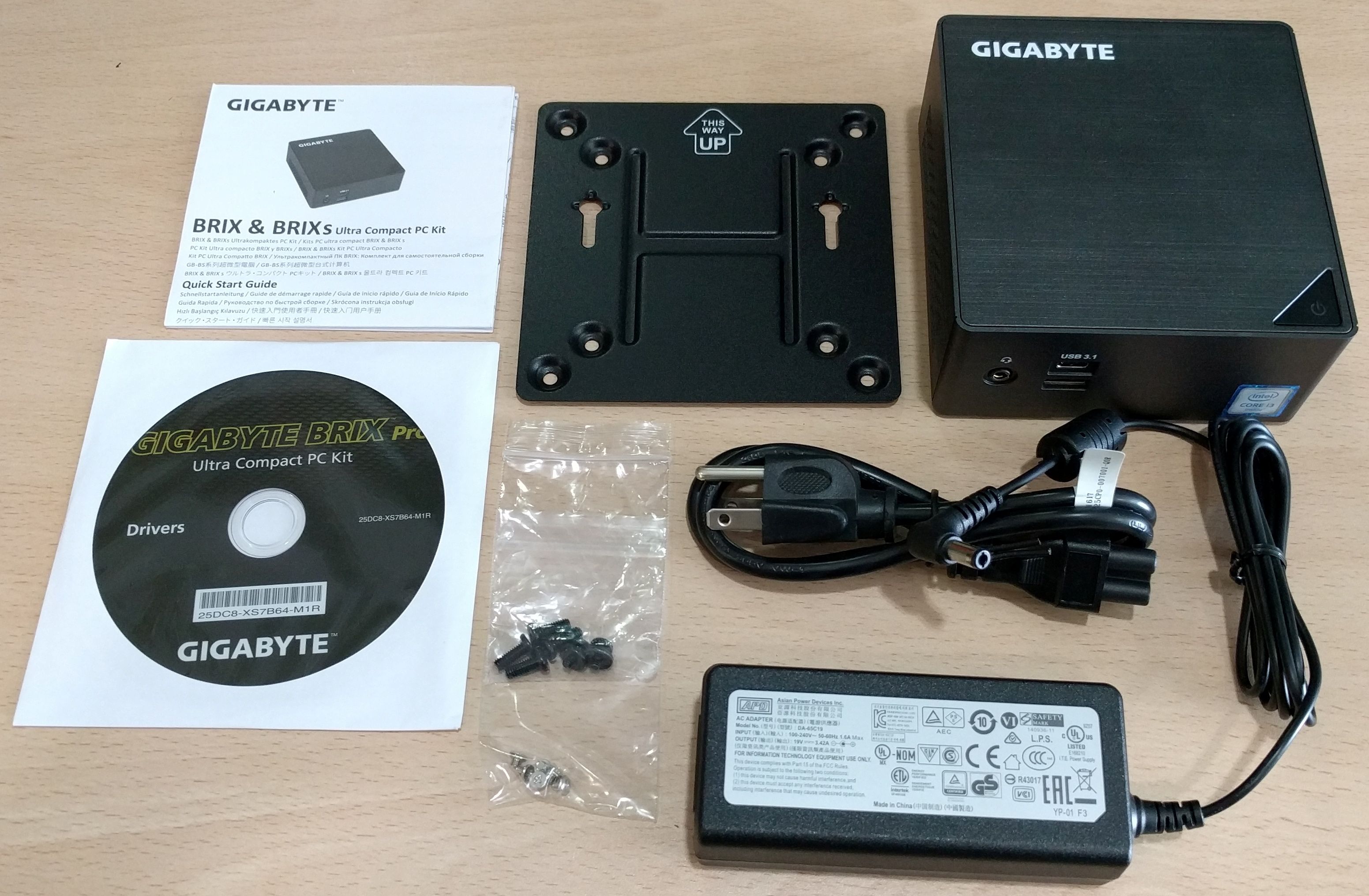 Además del ordenador compacto Brix, Gigabyte ha añadido un paquete de accesorios que incluye un adaptador de alimentación CA, placa de montaje VESA, instrucciones, tornillos y un disco de controladores para Windows 7/8/10.