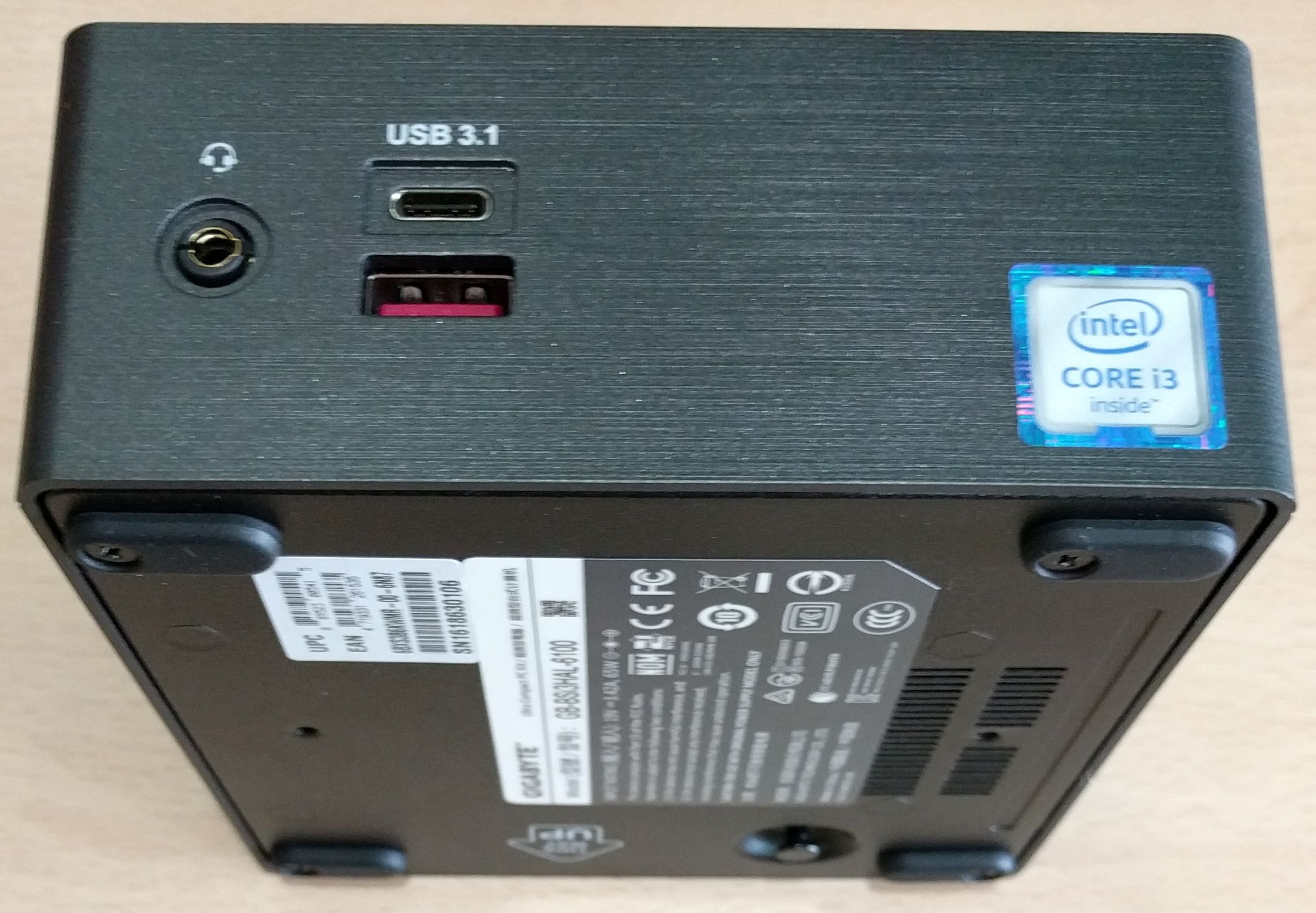 El lado frontal del Brix S cuenta con dos puertos USB 3.1, uno de ellos de Tipo C, un conector jack para auriculares/micrófono y una pequeña pegatina de Intel i3 inside.