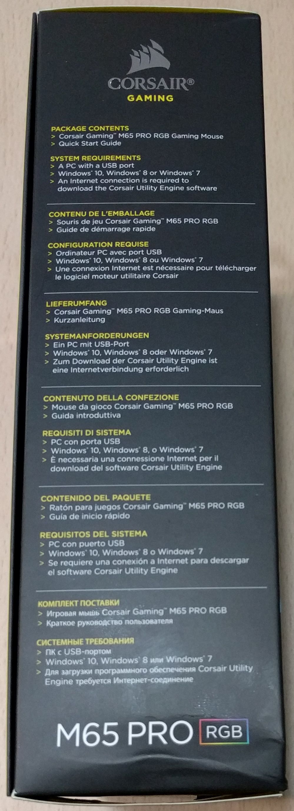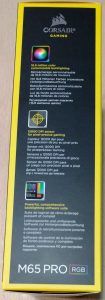En la parte frontal de la caja podemos encontrar una imagen del M65 Pro rgb con algunas de las características principales, el colo de fondo de la caja es negro con algunos detalles de color amarillo en ambos laterales y en la parte superior izquierda aparece el logotipo de Corsair en plateado brillante.