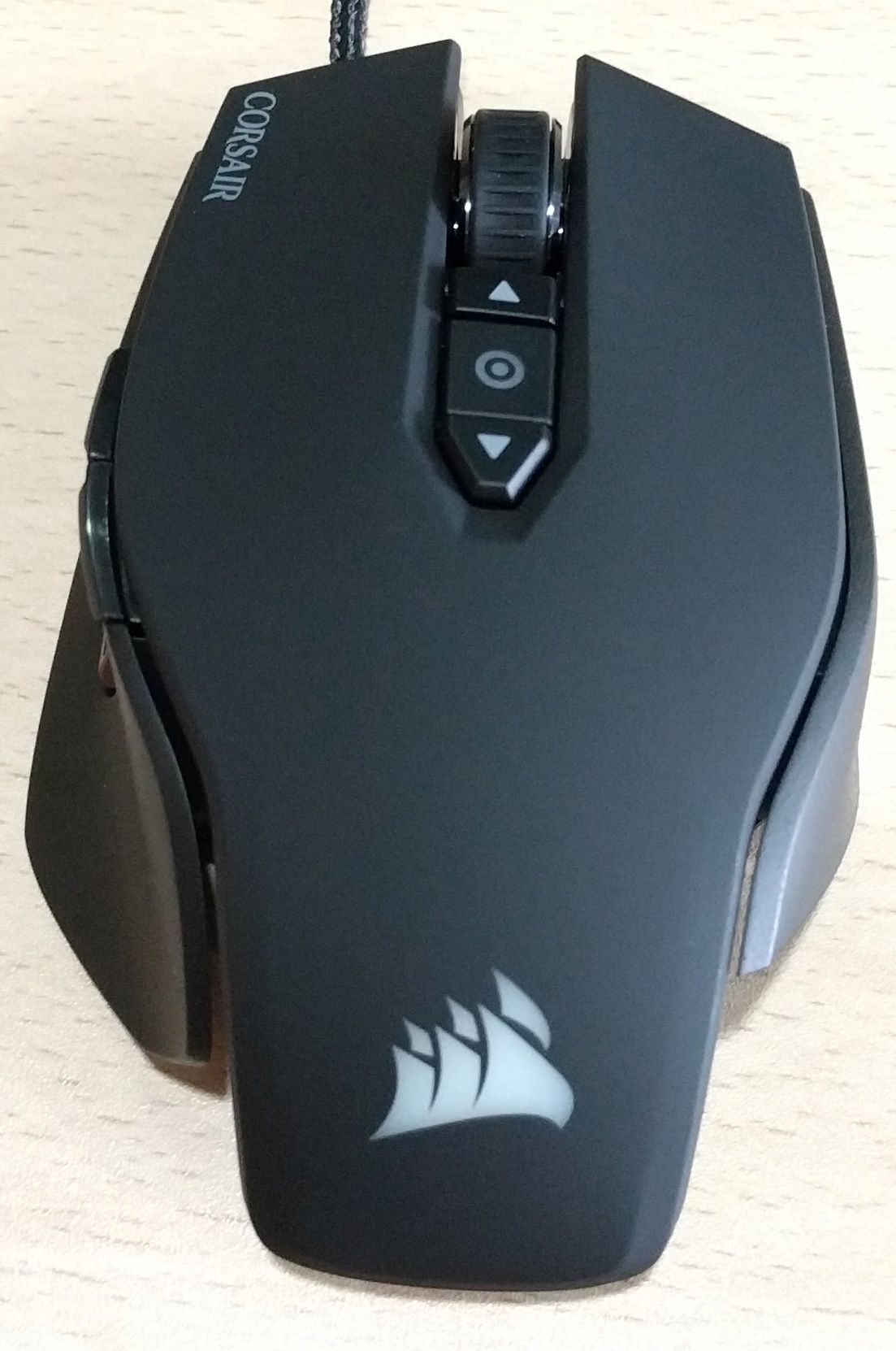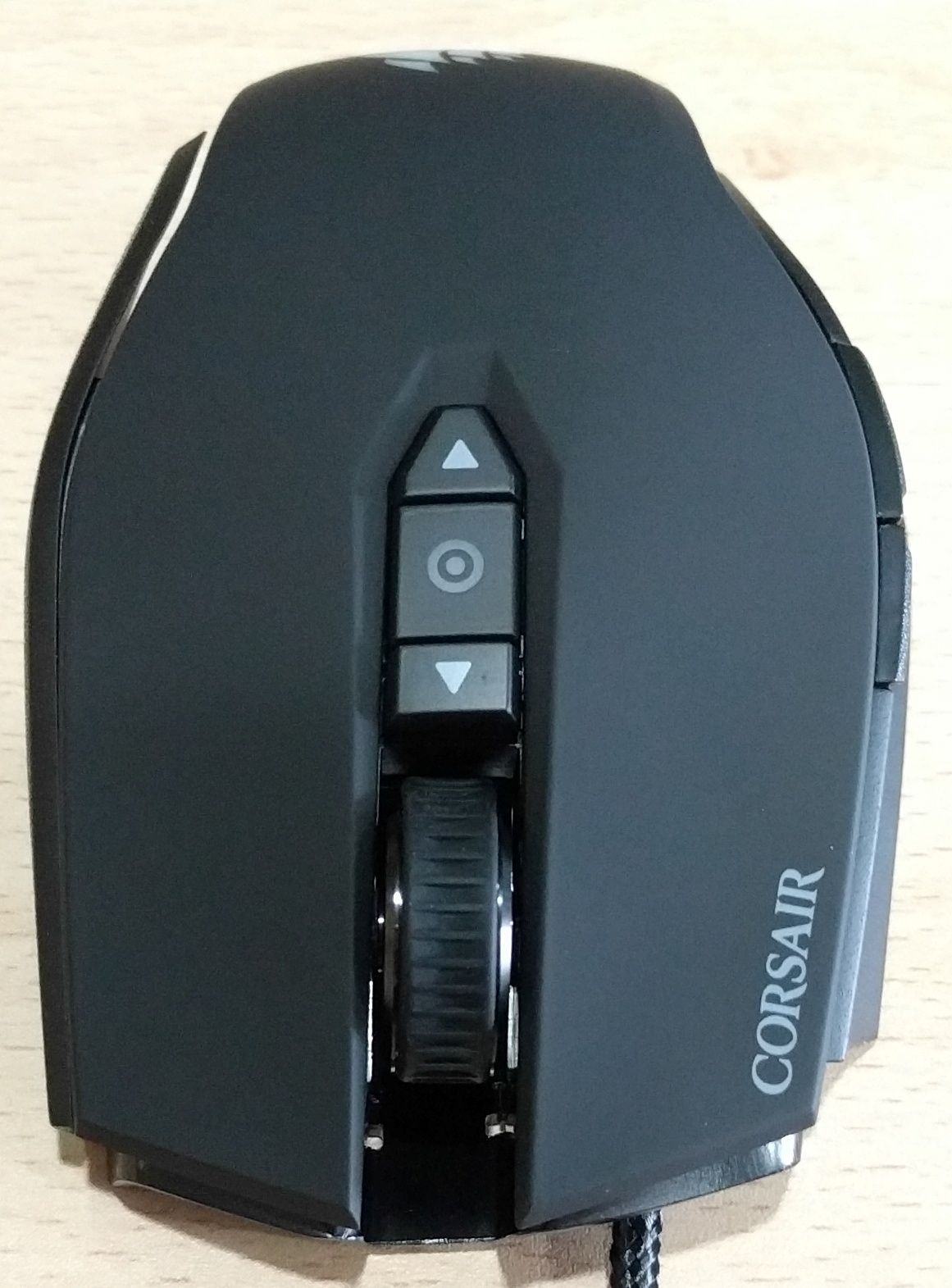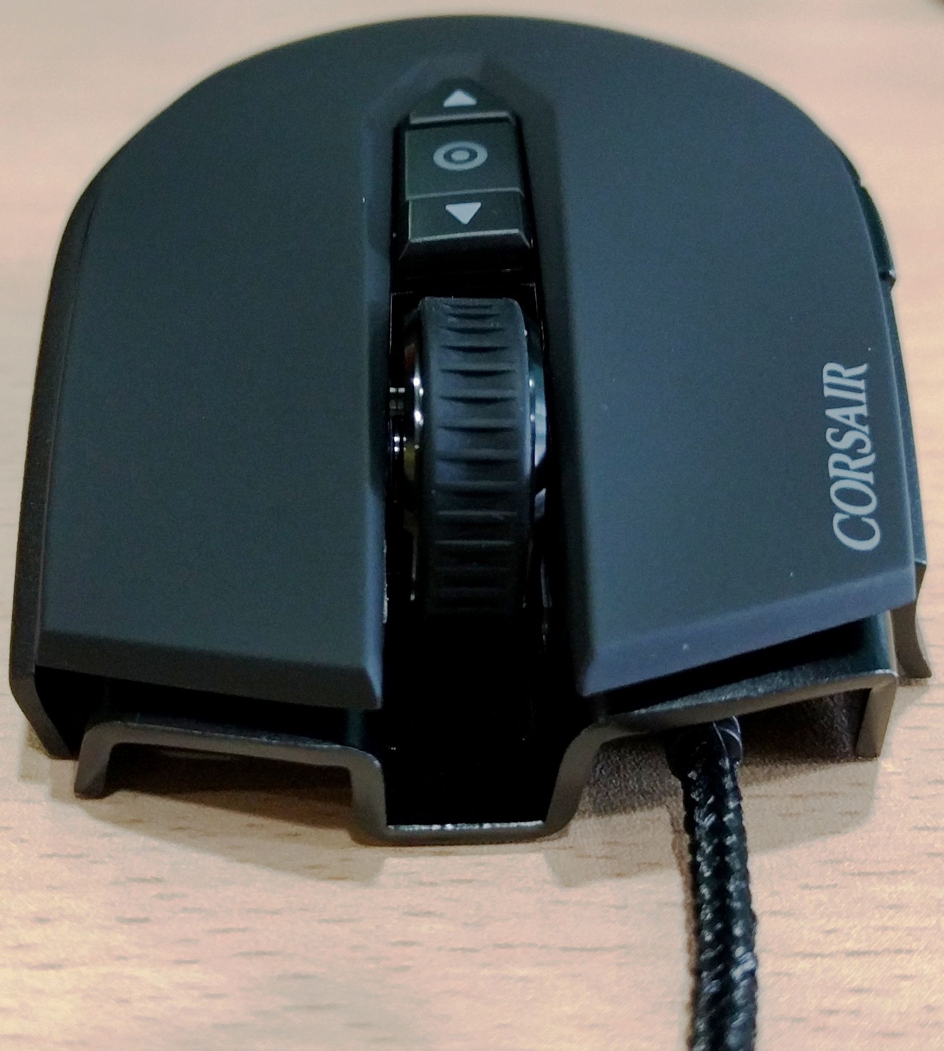 El M65 Pro RGB tiene un peso de 135.5g con los tres pesos instalados. En términos de tamaño es un ratón de tamaño mediano que mide 118 mm de longitud, 72 mm de ancho y 39 mm de altura. En la parte superior se puede ver los botones de selección de DPI. Junto al LED indicador de DPI se sitúa en la parte superior de la rueda de desplazamiento que a su vez también tiene función de botón. Corsair ha puesto su logo en la parte trasera del ratón (el anterior M65 RGB tenía el logotipo de Corsair y ademas las letras escritas – es un comentario para poder diferenciar entre la anterior versión y la nueva ya que estéticamente son idénticos -).