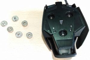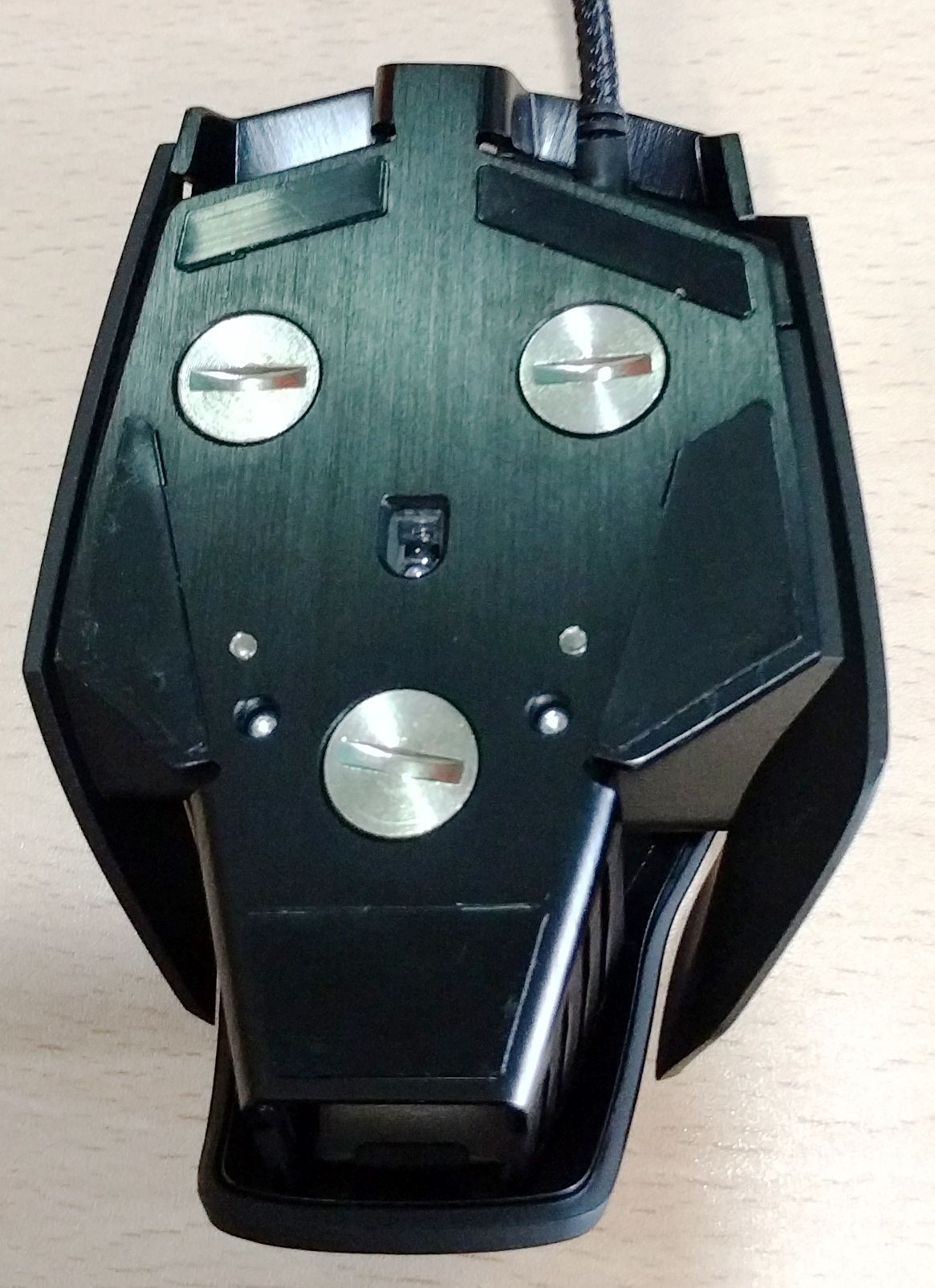 Dando la vuelta al ratón, vemos 5 laminas grandes de PTFE (politetrafluoroetileno) un materia que nos permite tener un movimiento muy suave del ratón a la vez que muy resistente al desgaste. También podemos observar el sensor óptico de 12000 dpi y tres tornillos redondos grandes, que es donde se alojan los pesos que podemos colocar o retirar según nuestras necesidades a la hora de jugar a los tipos de juegos que precisen mas o menos peso, eso ya queda a gusto del consumidor. Aunque Corsair no ha colocado una herramienta para que usted pueda desarmar estos tornillos puede hacerlo con una moneda. Estos tres tornillos son en realidad parte del sistema de ajuste de peso y pesan un total de 5,5 g. Cada tornillo se coloca sobre un solo peso 5g así que al final si se quita todos los tornillos y los pesos se puede reducir el peso del ratón en 20,5 g.