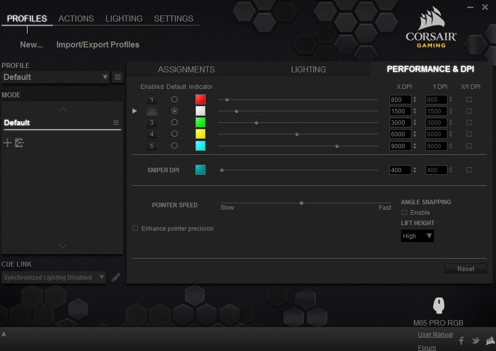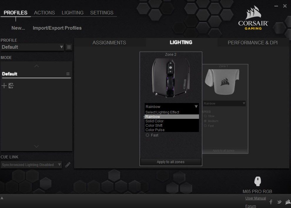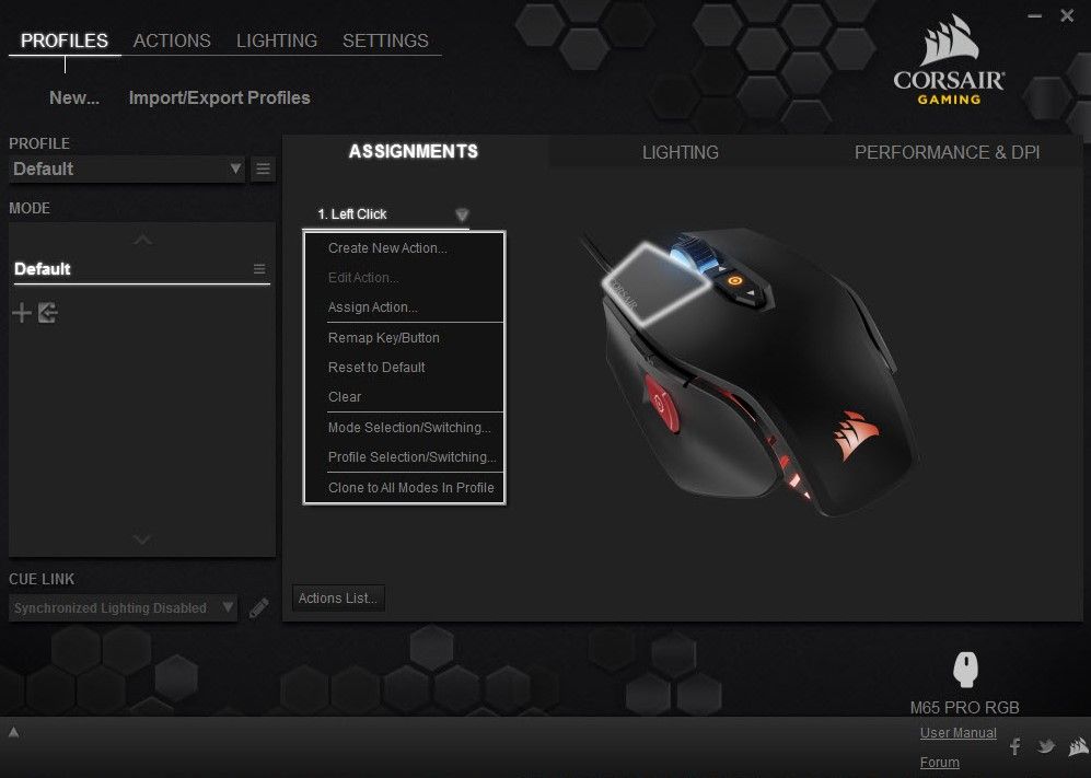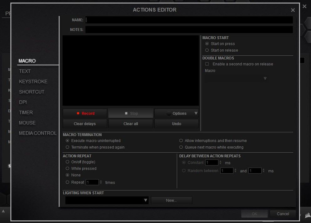 Desde las pantallas principales de la utilidad puede programar los 8 botones disponibles (asignar acciones), cambiar el color de iluminación y efectos para 2 de las 3 zonas, configurar el DPI (ambos ejes) de los 5 modos disponibles y habilitar y bloquear ángulo y precisión del puntero. El programa también permite al usuario final crear varias acciones como macros y las pulsaciones de teclado que más tarde puede asignar en los botones. También puedes crear tus propios efectos de iluminación, aunque esta es una característica que no hemos probado en profundidad.