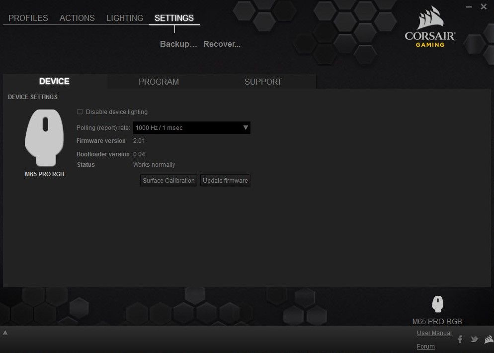 En la ultima pestaña del programa puede desactivar la iluminación, comprobar si hay una nueva versión del firmware, actualizar manualmente el firmware, realizar una calibración de superficie y varios ajustes sobre el programa (como el lenguaje, el arranque y más).