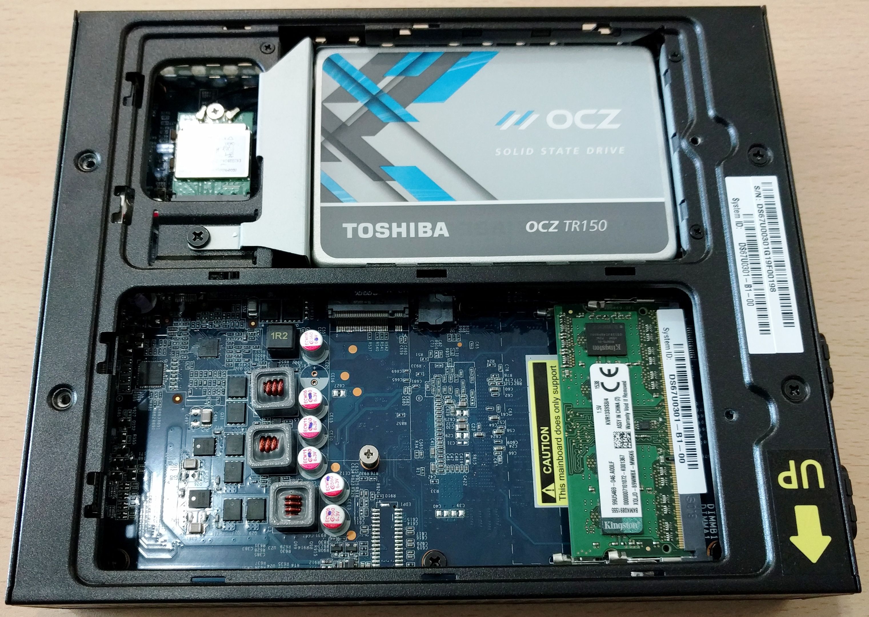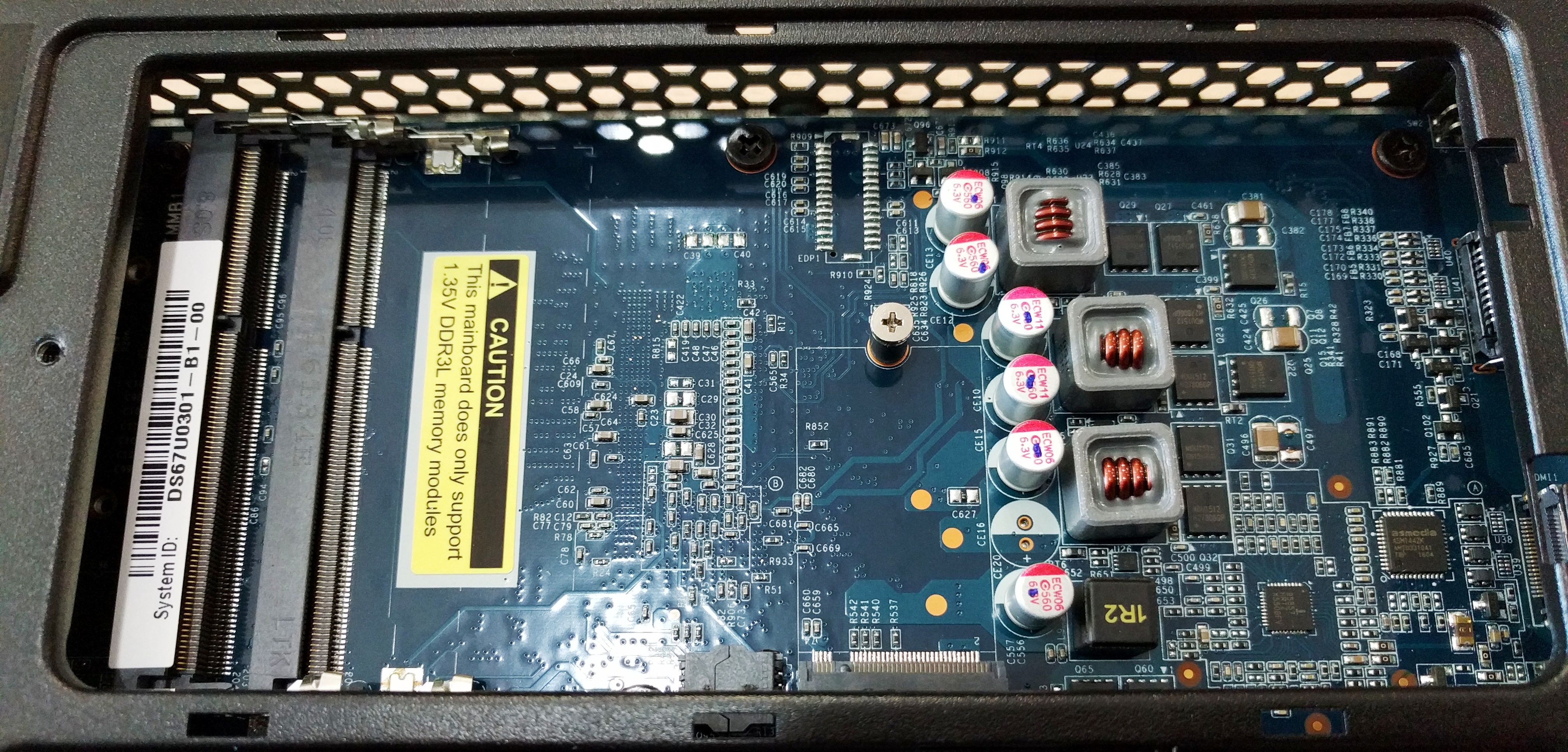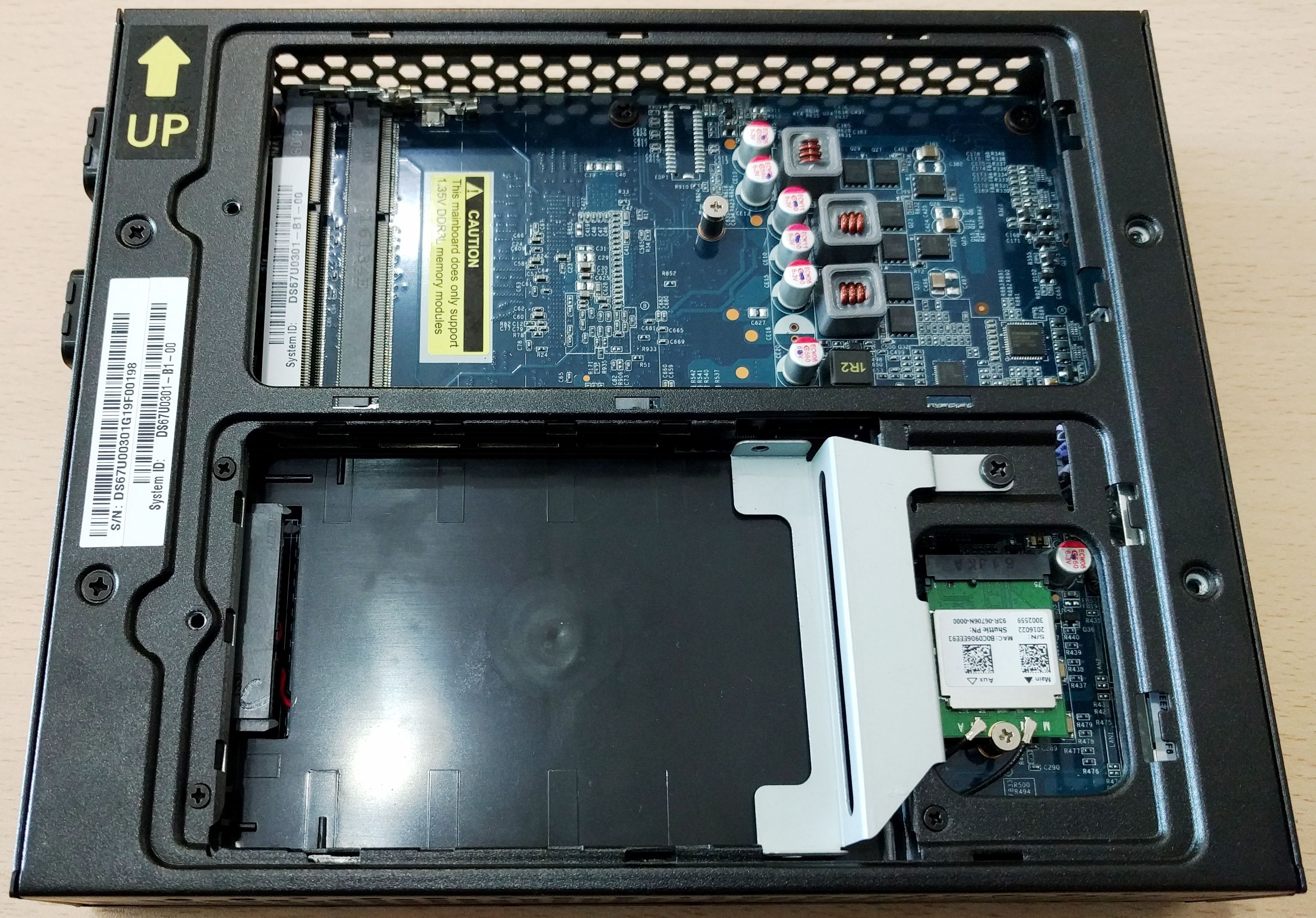 Con las dos tapas quitadas, vemos el espacio para la instalación de una unidad de almacenamiento, que puede ser SATA de 12.5mm, 9.5mm o 7 mm de grosor, aunque se aconseja poner un disco SSD (que ya son de 7mm) y funcionan infinitamente más rápidos que los discos mecánicos, así como que emiten mucha menos temperatura. Pero también se pueden instalar discos SSD M.2. También vemos los dos zócalos de memoria que soporta módulos de 16GB DDR3L a 1.35V, haciendo un máximo de 32GB. Y después ya vemos el módulo Wireless ya preinstalado de fábrica.