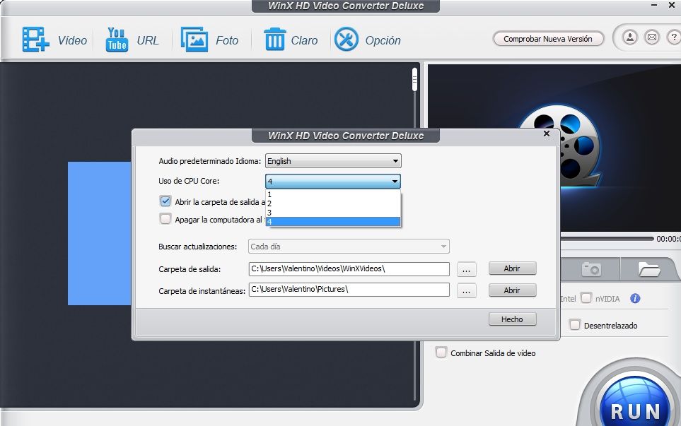 Podemos ver que al entrar en el apartado de Opción, el uso de los Core del CPU, los cuales puedes modificar para sacarle mejor provecho a la velocidad de conversión.