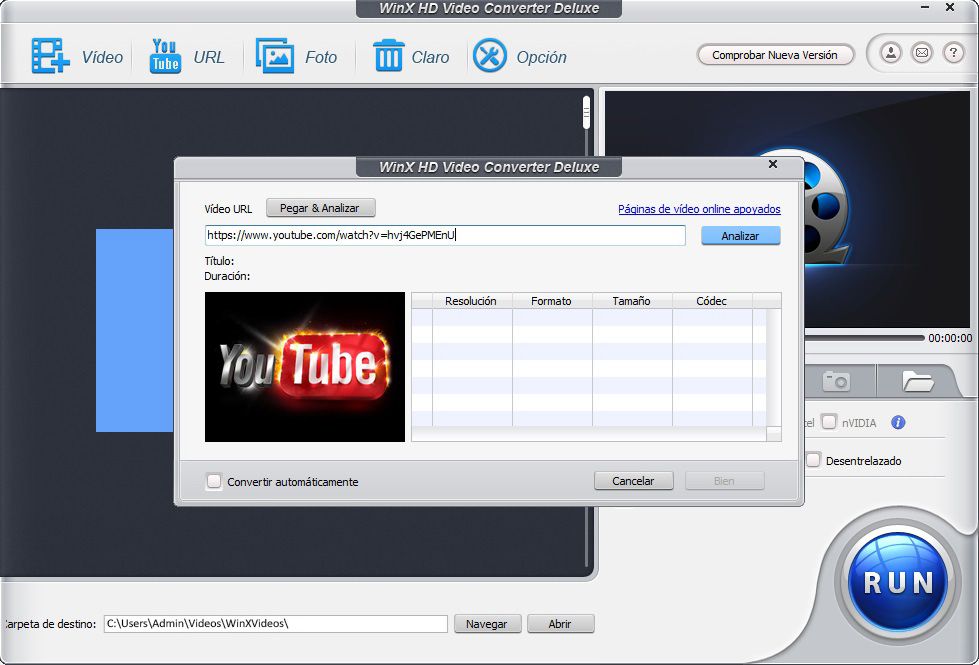 Dentro del software WinX HD Video Converter Deluxe, seleccionamos la opción donde se encuentra el logo de YouTube. Se nos desplegara un recuadro en el cual debemos de introducir el link del vídeo que queremos descargar y convertir. Le damos en Analizar.