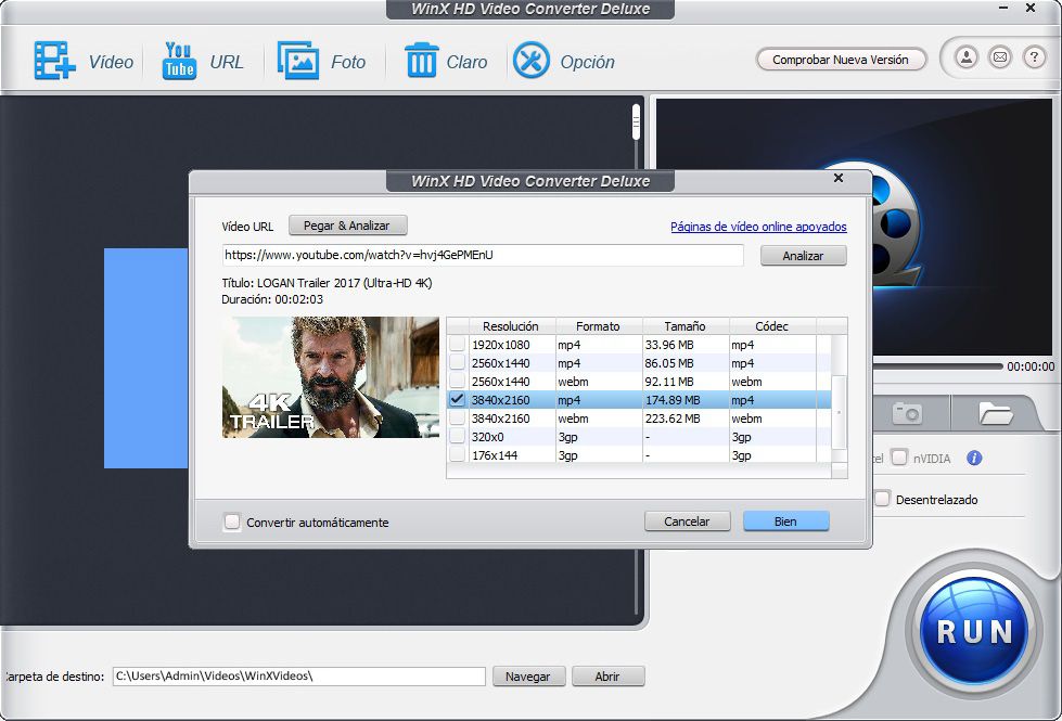 Nos saldrá como en la imagen de abajo y le damos click en RUN para comenzar con la descarga en 4k máxima resolución.