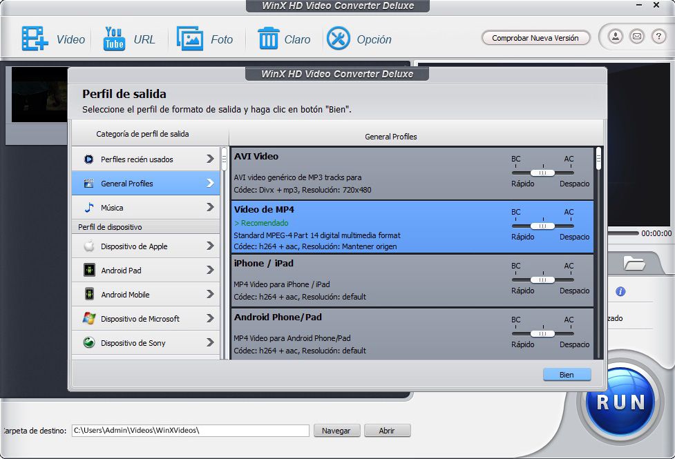 Ahora para convertirlo en MP4 optimizado sin perder la calidad, nos dirigimos a la parte superior izquierda, donde dice +Vídeo. Dentro de esa carpeta nos aparecerá el vídeo que hemos descargado y lo abrimos. Aparecerá un menú con todos los perfiles disponibles de salida. Elegimos uno de ellos (nosotros optamos por elegir Vídeo de MP4 que nos aparece como recomendado) y le damos click en Bien.