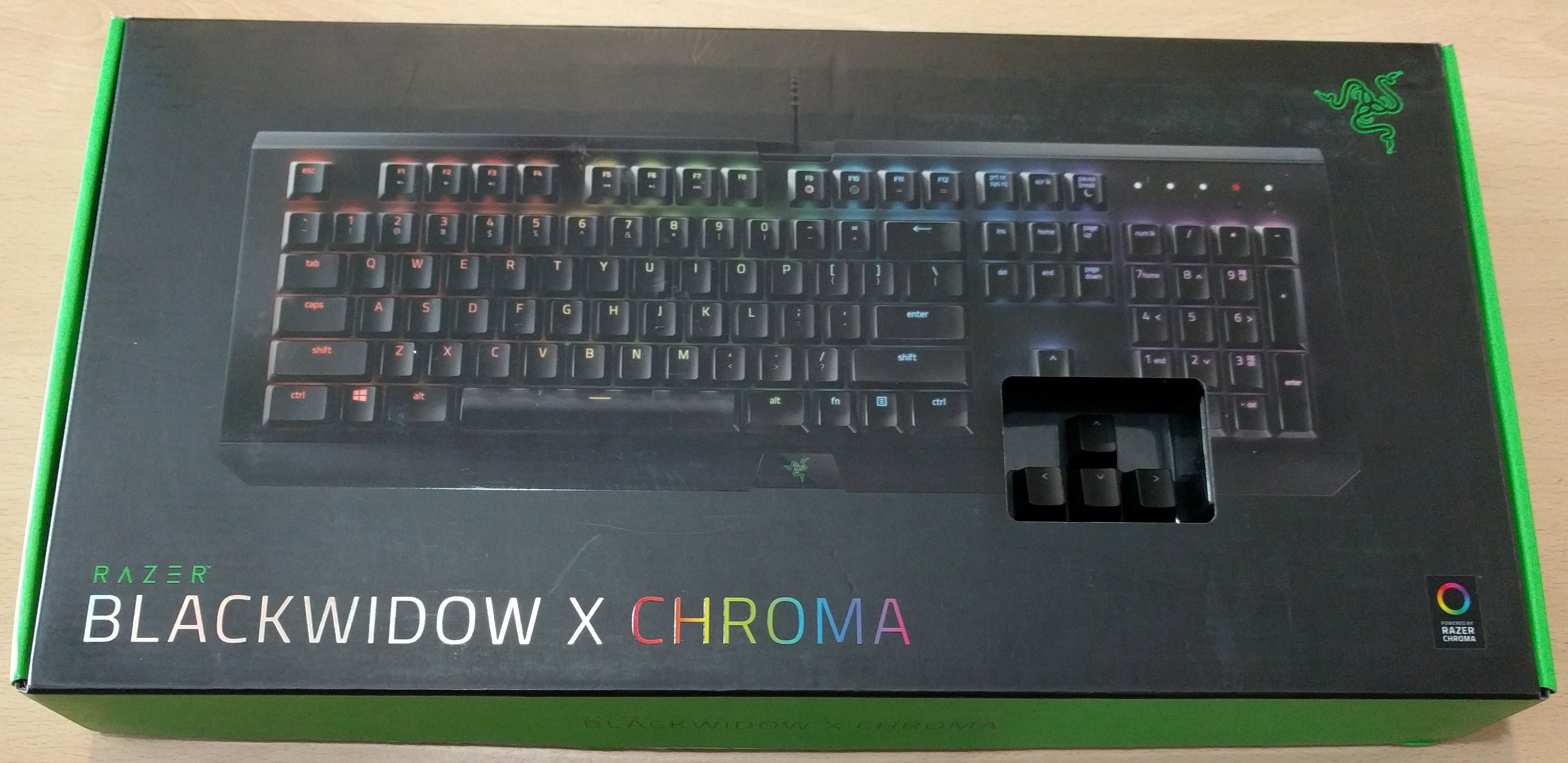 La presentación del teclado Razer Blackwidows X Chroma, se encuentra en una caja de cartón robusta de color negro como nos ofrece en cada uno de sus productos Razer. Donde nos muestra en su parte frontal el teclado haciendo presencia de su iluminación RGB LED. Además de contar con una pequeña ventana en la parte de las teclas de direcciones del teclado para probar el tacto de las mismas.