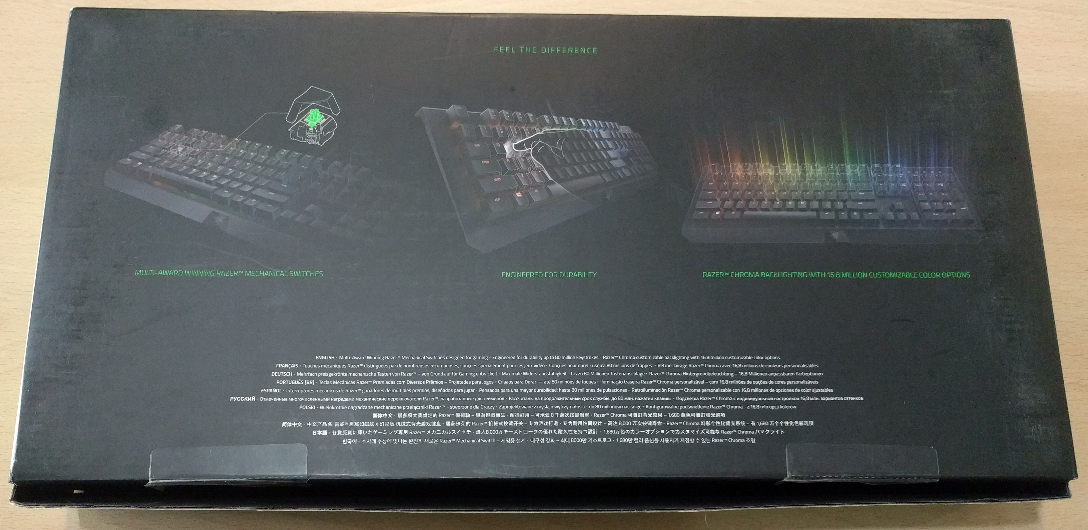 En la parte trasera de la caja nos muestra algunas de las características, como el sistema de interruptores de alta durabilidad, y las múltiples opciones de la retroiluminación Chroma de 16,8 millones de colores para personalizar el teclado. También se ven algunas indicaciones en la parte de abajo en varios idiomas.