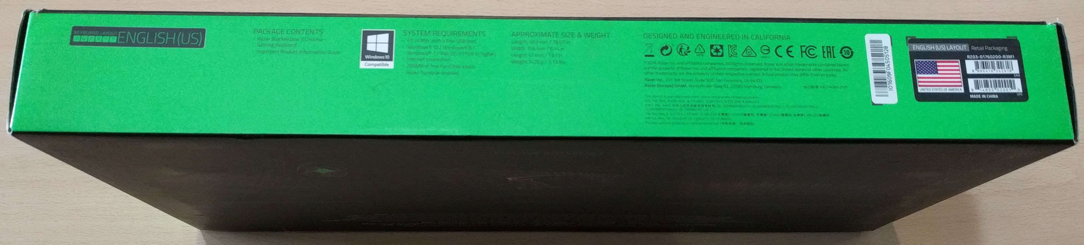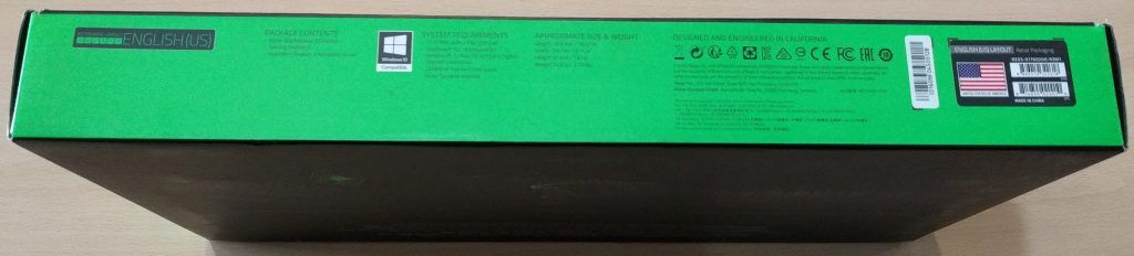 En los lados de la parte frontal y la parte trasera, observamos en grande el nombre de Razer Blackwidows X Chroma, lo que contiene en paquete, y los requisitos del sistema.