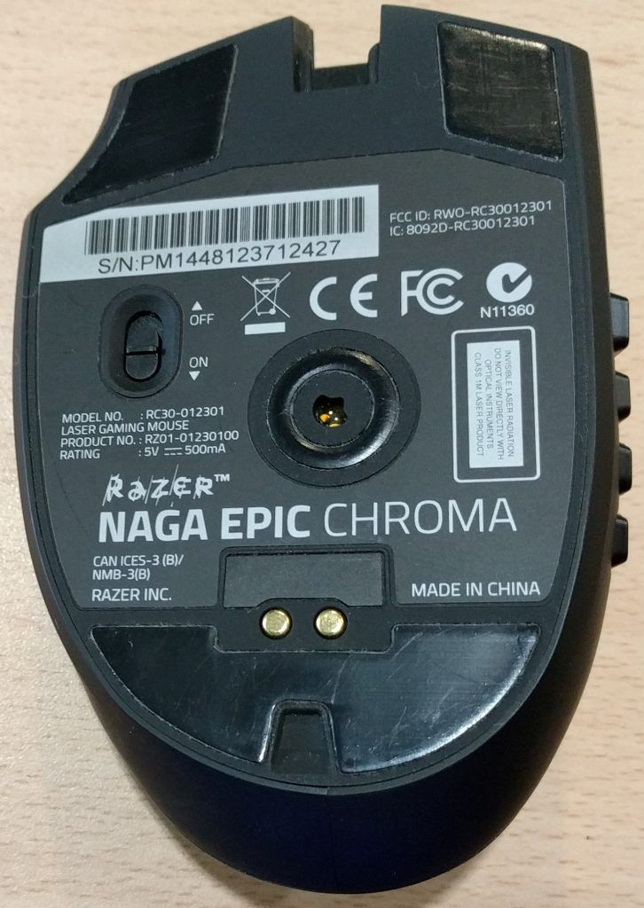 En la parte frontal podemos ver el logo de Razer y al estar encendido se logra apreciar en la rueda deslizante su iluminación Led Chroma configurable de hasta 16.8 millones de colores mediante el software Razer Synapse. También podemos apreciar los botones clásicos (izquierdo y derecho) y dos botones en el centro programables (por defecto para ajustar la sensibilidad del sensor). Mientras que en la parte de atrás del ratón podemos ver las típicas indicaciones y advertencias del mismo, junto a su interruptor de encendido y apagado.