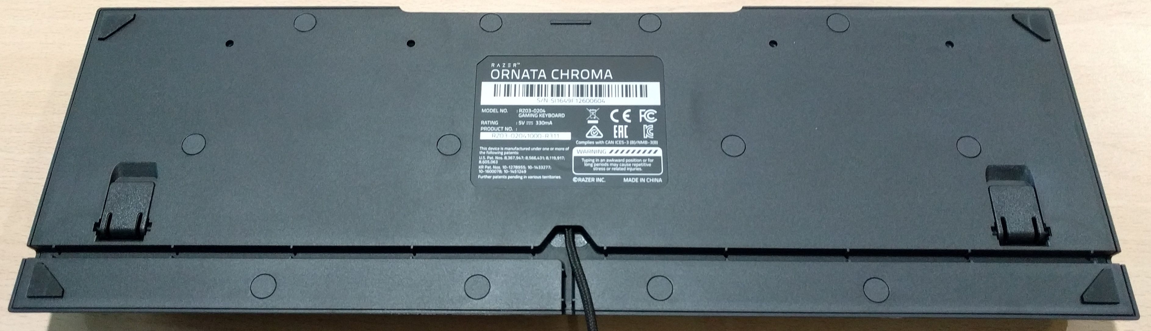 Podemos notar lo compacto que es este teclado, ya que presenta unas dimensiones de 463 x 154 x 31 mm. Esto es debido a que el Ornata no presenta teclas macro o multimedia dedicadas, por lo tanto el espacio se reduce convirtiéndolo en un teclado con menor dimensión. Por la parte trasera contamos con lo típico del teclado, como las patas para darle altura y tener mejor comodidad, y una guía para poder colocar el cable por el centro, derecho o izquierdo.