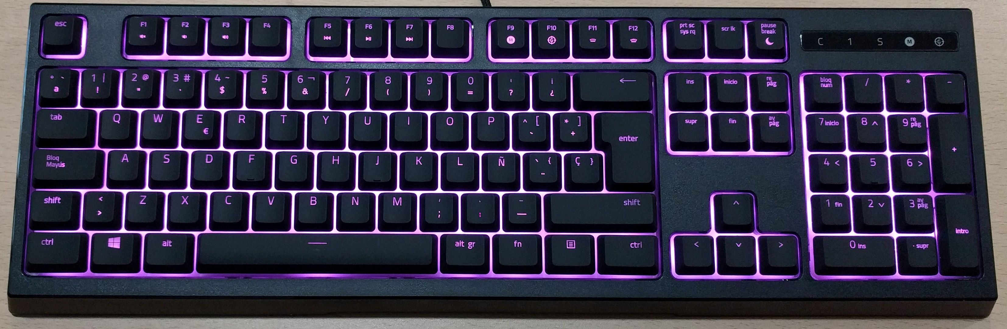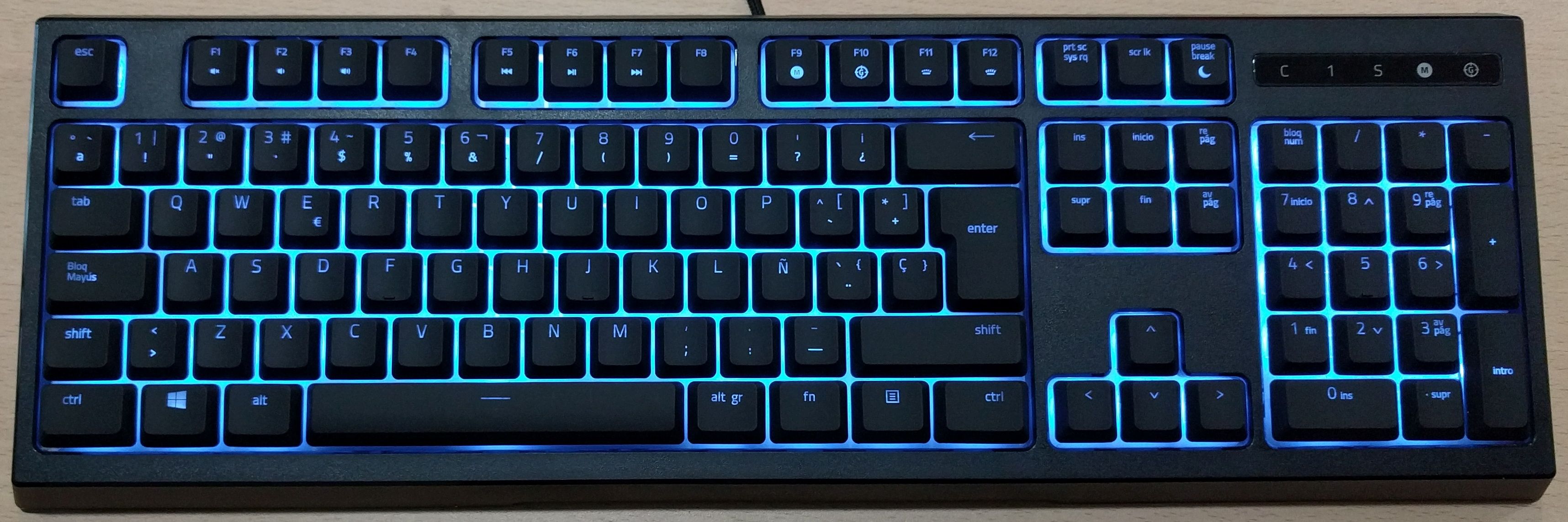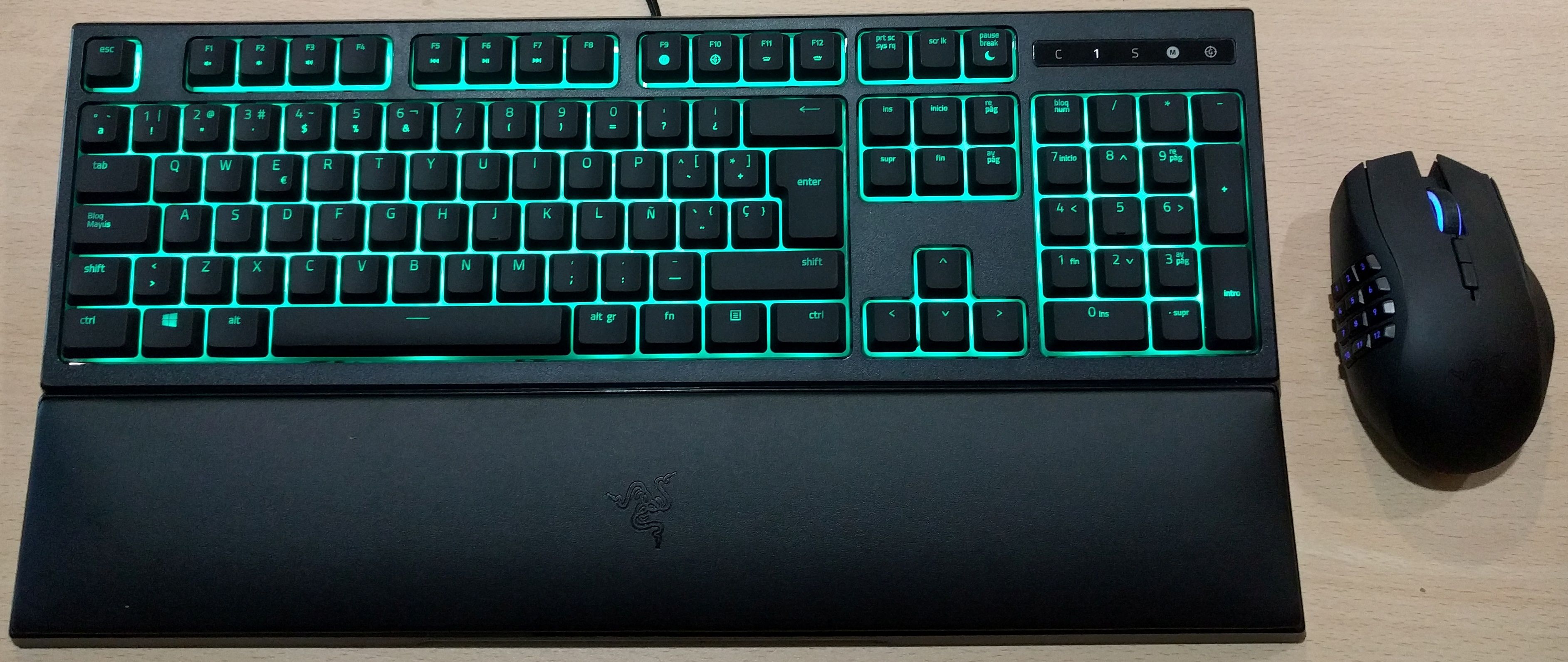 Una vez conectado el teclado al ordenador, podemos ver su variante de colores gracias al sistema Chroma de retroiluminación personalizable en 16,8 millones de colores para elegir. Podemos apreciar todo el contenido en conjunto con el reposamuñecas, el cual es muy cómodo para el usuario que pasa horas en un ordenador. Cuenta con un sistema de anclaje magnético que se une fácilmente al teclado.