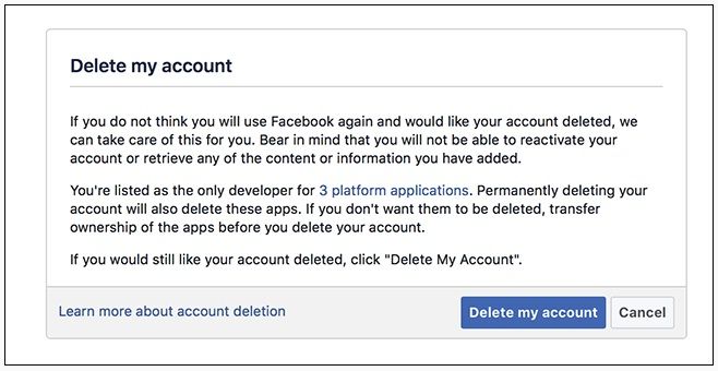 De acuerdo, no del todo. Hay un período de enfriamiento de 14 días en el que puedes iniciar sesión en tu cuenta y detener el proceso de eliminación. No inicies sesión durante dos semanas y se va de verdad. Todos los datos de tu cuenta se eliminarán de los servidores de Facebook (aunque puede tardar hasta 90 días en eliminarse por completo). Por lo que probablemente sea una buena idea obtener primero una copia de seguridad.