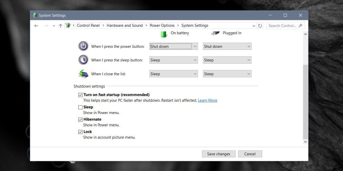 Haz clic en la opción Elegir lo que hacen los botones de encendido a la izquierda. Haz clic en la opción Cambiar configuración que no está disponible actualmente. Habilita la opción Hibernar y comenzará a aparecer en el menú del botón Encendido en el menú Inicio.