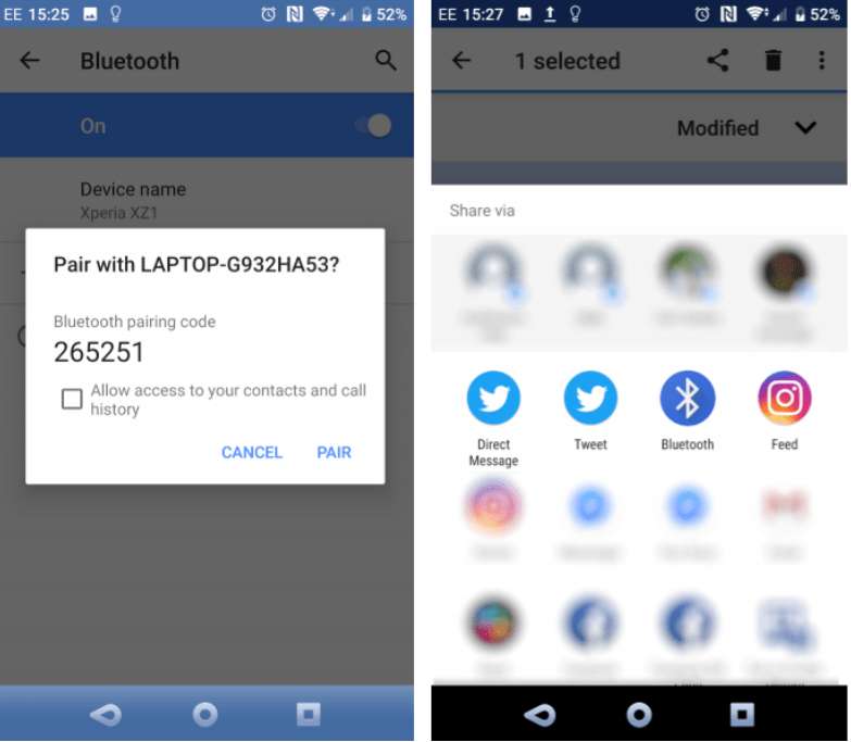 Mientras tanto, utiliza tu navegador de archivos Android o la aplicación Gallery para seleccionar el archivo que deseas transferir. Utiliza el botón Compartir y selecciona Bluetooth para compartir los datos y, a continuación, selecciona tu ordenador en la lista siguiente.