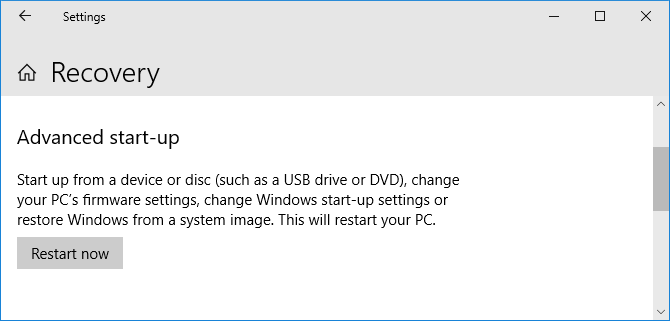 Primero, arranca en Modo a prueba de fallos. Para ello, pulsa la Tecla Windows + I para abrir Configuración. Selecciona Actualización y seguridad > Recuperación. Debajo de Inicio avanzado, haz clic en Reiniciar ahora.