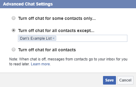 Igualmente, cuando hagas clic en una de las dos opciones, Facebook te pedirá que ingreses el nombre de una persona o el nombre de una lista. Debes comenzar a escribir el nombre de la lista que acabas de crear, y el cuadro se llenará automáticamente. Ahora bien, la opción final te hace aparecer fuera de línea para todos.