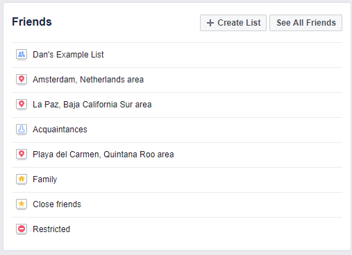 Inmediatamente notarás que Facebook ya ha creado algunas listas en tu nombre. Las listas se pueden dividir en tres categorías: listas predefinidas, listas inteligentes y listas personalizadas.