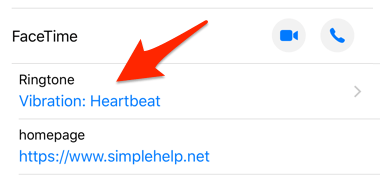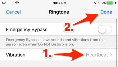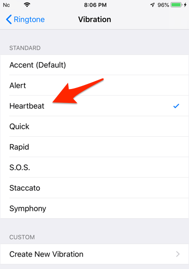 Desde aquí puedes elegir un patrón de vibración pre-creado (el del latido del corazón es genial) o crear el tuyo propio seleccionando Crear nueva vibración. Cuando hayas hecho tu selección o creado la tuya propia, toca el enlace Tono de llamada en la esquina superior izquierda para volver a la pantalla anterior.