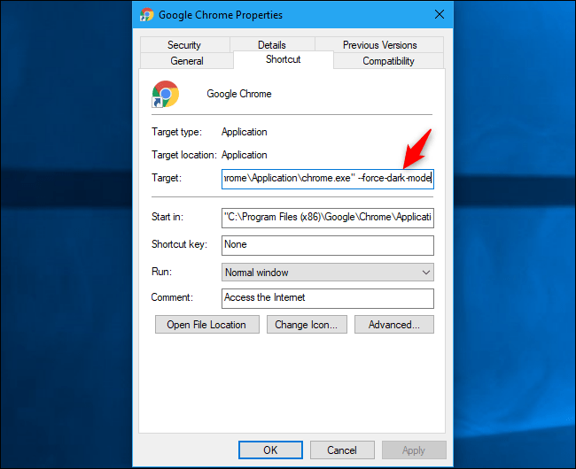 «C:\Program Files (x86)\Google\Chrome\Application\chrome.exe» –force-dark-mode