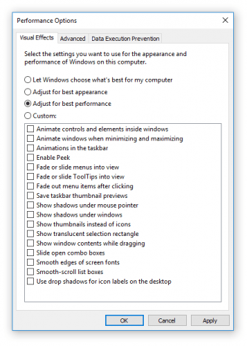 Esta opción desactivará todos los efectos visuales innecesarios que permitirán ahorrar recursos como Memoria RAM y actualmente darte mayor rendimiento en Windows 10.