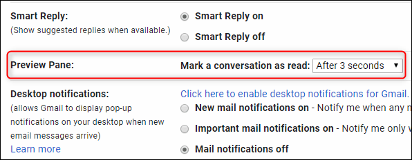 Cuando tienes el panel activo, se mostrará una nueva opción. Dirígete al ícono de engranaje, has clic en “Configuraciones” y en la pestaña general que se abre, habrá una nueva opción del Panel de Previsualización. Esta opción te permite escocjer cuando un correo está marcado como leído si lo estás viendo en el panel de previsualización.