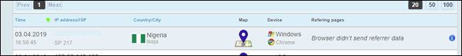 Esto tiene sus limitaciones. Cualquiera puede usar una VPN para enmascarar su ubicación real. Pero, incluso si lo son, hay una buena posibilidad de que la VPN muestre una ubicación diferente de donde dicen estar. En el caso de nuestro falso reclutador de trabajo, el estafador afirmó estar en los Estados Unidos, pero accedieron a nuestro enlace desde una dirección IP con sede en Nigeria.